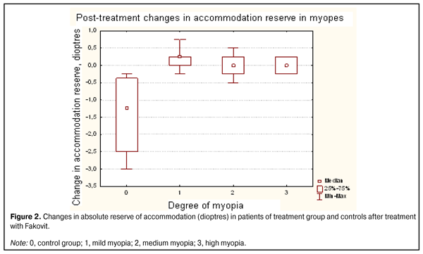 After treatment with Fakovit, a 0.25 D to 0.75 D improvement, no change, and a 0.25 to 0.5 D reduction in reserve of accommodation (RA) was observed in 44.4%, 38.8%, and 16.6%, respectively, of patients of the treatment group. At the same time, a 1.43±1.29 D reduction in RA (p<0.05) was observed in all controls (Fig. 2).