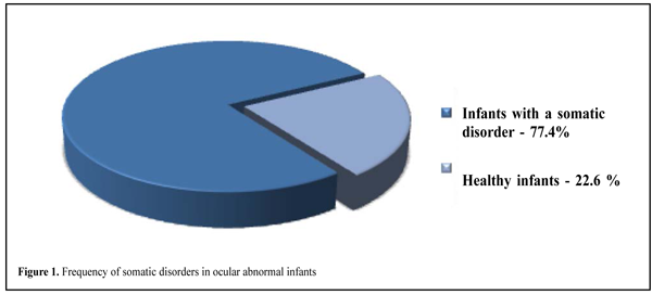 Not only the period of the fetal exposure (a critical period of the embryogenesis) to the teratogenic agent, but also the exposure time, teratogen dose and the maternal and fetal genetic constitution are important for the development of CFM. Table 3 presents the spectrum of somatic disorders found in association with congenital ocular anomalies in infants under study. The central nervous system (CNS) injury was the leading concomitant somatic disorder (51.8%), mainly due to hypoxic and traumatic perinatal CNS injuries resulting in the development of disorders of cerebrospinal fluid (CSF) flow dynamics and motor disorders of different severity (and even the development of pareses, paralyses, or convulsive disorder) (42.4%). This was caused by a reduction in the resistance of the brain of the infant to teratogenic intranatal factors following exposure to intrauterine aggression.