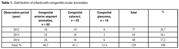 https://doi.org/10.31288/oftalmolzh201611218 Concomitant somatic disorders in infants under one year with congenital ocular anomalies N.F. Bobrova, Dr. Sc. (Med), Prof O.N. Romanchuk, pediatrician Filatov Institute of Eye Diseases and Tissue Therapy Odessa, Ukraine E-mail: filatov_detskoe@mail.ru Background: Recent studies of the clinical features and pathogenesis of the acquired, progressive and complicated myopia have evidenced that patients with this disease have reduced antioxidant defense. It is hypothesized that pharmacological correction of antioxidant defense system failure will improve visual functions in myopes. Purpose: To assess the status of visual functions (including distance visual acuity, absolute reserve of accommodation and photopic light sensitivity) in patients with myopia of different degrees before and following treatment with an antioxidant medication (Fakovit). Materials and Methods: The Fakovit treatment group included 70 myopes (140 eyes) (mild myopes, n = 28; medium myopes, n = 22; high myopes, n = 20), whereas the control group included 30 aged matched myopes who did not receive Fakovit treatment. All patients underwent ophthalmic examinations including refractometry, biomicroscopy, echobiometry, ophthalmoscopy, and absolute reserve of accommodation. The uncorrected and corrected distance visual acuities (VA) were assessed using the Shevalev’s Chart, and absolute reserve of accommodation (RA) was assessed using a conventional technique. Photopic light sensitivity was assessed with the use of semi-automatic registering adaptometer. Results: An improvement in VA was achieved in 86.1% of mild and medium myopes of the treatment group. An improvement in and stabilization of RA was found in 44.4% (mainly, in mild myopes) and 38.8%, respectively, of the patients of the treatment group, and a 1.43±1.29-D reduction in RA (p < 0.05) was observed in the control group. Photopic light sensitivity of the visual system had a tendency to increase in all myopes after treatment with Fakovit (in particular, it increased statistically significantly by 0.16±0.04 log units in mild myopes), and did not change in the controls. Conclusion: Correction of antioxidant defense system failure with Fakovit improved and stabilized visual functions (visual acuity, reserve of accommodation, and photopic light sensitivity) in myopic patients. Key words: infants, congenital fetal malformations, cataract, glaucoma, intrauterine infection Introduction Child health protection is an important current medical, social and state issue and involves a set of tasks aimed at reducing the perinatal and child mortality rates, promoting health of children at different life stages and preventing child disability, congenital and hereditary diseases from occurring [1, 2]. Somatic disorders are the most common cause of disability in children, followed by central nervous system (CNS) and sensory organ disorders, and congenital malformations and anomalies. Congenital fetal malformations (CFM) are one of the most dangerous complications of pregnancy and a leading cause of death and disability among infants. According to the WHO Expert Committee, population rate of congenital malformations and anomalies is 1.5% to 5% (with 2.7% to 16.3% variations in some countries), with the prevalence of 40-60/1000 live births [3]. According to Pokanevich [4], the mean prevalence of congenital, including hereditary disorders among newborns in Ukraine during 1993 to 2001 period was 26.31/1000 live births. CFM form a wide polyetiological group of ontogenetic disorders caused by teratogenic exposure, chromosomal abnormalities and gene mutations. The most common teratogenic agents are fetal exposure to unfavorable environmental factors (chemicals, medications and radiation), viral and bacterial infections (measles, rubella, herpes, cytomegalovirus, Toxoplasma and Chlamydia), hereditary load of gene and chromosomal mutations and their combinations. However, at least 25% of CFM cases are idiopathic [2, 5-8]. These are sporadic birth defects which are not likely to occur in future children. The purpose of the study was to analyze concomitant somatic disorders in infants under one year with congenital ocular anomalies. Materials and Methods We retrospectively analyzed the medical records (In-patient Medical Record, f.112/u recording form) of 129 infant patients under one year with congenital ocular anomalies who were treated at the Pediatric Ophthalmic Department of the Filatov Institute from 2012 to 2014. The following data were taken into account: any history of extragenital or obstetric disorder of the mother, pregnancy and labor course, child’s gestational age and health status, results of laboratory (complete blood count, urinalysis, blood biochemistry, immune status, TORCH markers, and stool analyses) and instrumental (neurosonography, electroencephalogram, electrocardiogram, sonography of internal organs and brain MRI) examinations, and considerations reported by subspecialists (neurology, cardiology, otorhinolaryngology and pediatrics). Mean infant patients age was 6.25 ± 2 months, with a range of 1/2–12 months. Results and Discussion We registered different congenital malformations of the anterior segment (abnormalities of eye size and corneal size (microphthalm, mircocornea and macrocornea), and changes in iris structure and color (heterochromia and coloboma)), congenital cataract and congenital glaucoma in infants under study. The yearly number of ocular abnormal infant patients visiting the clinic showed a tendency to increase (Table 1) from 37 (28.7% of the study group) in 2012 to 44 and 48 (34.1% and 37.2%) in 2013 and 2014, respectively. Most likely, this was not only due to advances in diagnostic techniques but also due to an actual increase in the number of infants with different congenital (including ocular) malfunctions. Visualized anatomic anterior segment anomalies (changes in eye size and corneal size such a