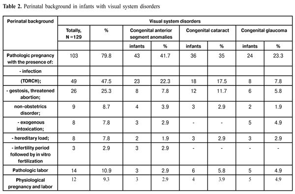 The in utero developmental period is the most important stage of the organogenesis. Several critical embryonic and fetal developmental stages are identified during which the germ is highly susceptible to different unfavorable environmental factors. The first critical embryonic developmental stage is during the first 14-15 days of fetal life when cell differentiation and formation of germ layers and extraembryonic tissues take place. The developing embryo responds to the environmental exposure according to the all-or-nothing principle. It either dies or continues to develop perfectly normally due to its high reparative capability. The second critical developmental stage is during gestation weeks 3-8, when the most important organs are formed. Additionally, at this stage, severe congenital fetal malformations (those of the neural tube, heart, vascular system, skeletal system and kidneys) are formed. These malformations are called embryopathies and are found in 13% of embryos; in most of such cases, a pregnancy terminates in a miscarriage. The CFM formed since gestation week 9 (the third critical developmental stage) are called fetopathies and are characterized by hypoplasia of different organs and the fetus at large; in such cases, a pregnancy terminates in a miscarriage or results in the birth of a malformed fetus. Teratogens are internal and external environmental factors that can cause defects, cell death and alteration in cell differentiation in the developing embryo. Teratogenic exposure at different stages of embryogenesis may result in an alteration in the morphological differentiation of multiple organs and structures (and alteration in the morphogenesis of ocular structures in particular) [9, 10]. We retrospectively analyzed the health status and labor course of mothers of infants with congenital ocular anomalies. The following perinatal risk factors were taken into account: any history of extragenital or obstetrical disorder of the mother, viral and/or bacterial infections of any etiology during pregnancy, aggressive external factors (exogenous intoxication), pathologic pregnancy (gestosis, threatened abortion) and labor course, and a hereditary load. Table 2 presents the analysis of perinatal background of infants with congenital ocular anomalies. One hundred and three infants (79.8%) with visual system defects were born after complicated pregnancies with fetal exposure to aggressive external or internal factors. Viral and bacterial agents played a rather important role in the development of CFM of different organs. Viral infection had been detected during pregnancy in 49 women (47.5%). In 9 women, acute or exacerbation of chronic TORCH infection was present during pregnancy.
