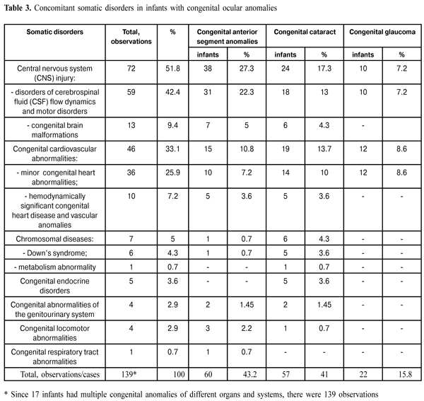 Congenital brain malformations were diagnosed in 13 cases (9.4%), including manifestations of hydrocephaly, microcephaly, neuronal migration disorder and brain and cerebellar hypoplasia in 8 cases, 2 cases, 1 case and 2 cases, respectively. Cardiovascular system examination revealed 46 cases of structural cardiovascular (CVS) disorders in infants of the study. Dysplastic alterations (tricuspid and mitral insufficiency with regurgitation, patent foramen ovale, anomalous trabeculae in heart cavities) were identified in 36 cases (25.9% of total cases of concomitant somatic disorders). Hemodynamically significant congenital heart disease (CHD) and vascular anomalies (ventricular septal defect, interatrial septal defect, transposition of vessels, and complete atrioventricular septal defect) were diagnosed in 10 cases (7.2%), including 2 cases associated with cardiac conduction system damage and cardiac rhythm disturbances. In 7 cases (5%), congenital ocular anomalies were involved into a genetic defect (Down syndrome or amino acid metabolism abnormality). It has been reported [11,12,13] that a chromosomal aberration may be caused by altered immune reactivity (dysimmunoglobulinemia and increased levels of circulating immune complexes with teratogenic effect). Four congenital genitourinary abnormality cases (2.9%) were related to renal malposition, malformation, and/or urinary tract dilatation, and involved 2 cases associated with genital organ malformation. Congenital locomotor abnormalities, mostly maxillofacial injuries (congenital palatal fistula, oblique facial cleft) and hip joint dysplasia were registered in four cases (2.9%) and were associated with congenital abnormalities of eye size and ocular structures. Congenital respiratory tract abnormalities were found in 1 infant of the study. With the coincidence in terms of differentiation of fetal organs and tissues, interaction of different mutagenous, teratogenous and embryotoxic factors at different stages of ontogenesis can result in the development of multiple congenital anomalies. Multiple congenital anomalies including disorders of different organs and systems with concomitant ocular injury were observed in 17 out of 100 infants with somatic disorders. The most frequent were the combinations of congenital abnormalities of the CNS and CVS. Developmental abnormalities of heart vessels and cavities were registered in 9 infants with congenital brain malformations (microcephaly, hydrocephaly, brain and cerebellar hypoplasia, structural brain abnormalities). Multiple internal organ anomalies were observed in infants with chromosomal aberration (Down syndrome and amino acid metabolism abnormality, 6 infants and 1 infant, respectively). Thus, brain injuries were associated with CHD (complete atrioventricular septal defect, ventricular septal defect, interatrial septal defect) and underactive thyroid function (hypothyroidism) in infants with trisomy 21 (Down syndrome) of the study, and the development of CNS, CVS and osseous system defects was observed in an infant with amino acid metabolism abnormality. The data presented demonstrate that anterior segment and lens abnormalities were most frequently associated with CNS injuries and CVS injuries. Thus, association of anterior segment and lens abnormalities with CNS injuries and CVS injuries was observed in 38 cases and 15 cases, respectively. Congenital cataract was associated with CNS injuries (24 cases) and CVS injuries (19 cases), whereas associations of congenital ocular anomalies with other internal organ system abnormalities were less frequent. Congenital brain malformations (leukomalacia, cortical dysplasia, microcephaly, brain and cerebellar hypoplasia, developmental abnormalities of the CSF tract) diagnosed result in the development of severe dysfunctions accompanied by motor disorders and world perception abnormality. Anatomic and functional defects of internal organs and a perinatal CNS injury with the development of disorders of CSF flow dynamics of different severity especially, contribute to the development of cerebral circulation, dystrophic, edematous-and-hemorrhagic abnormalities which exacerbate the pre- and post-operative courses and affect the outcome of surgery for correction of ocular disorder. Furthermore, delayed psychomotor development following CNS injury affects perception and analysis of visual images and, consequently, eventual functional outcome. Presence of a severe congenital cardiovascular abnormality and cardiac conduction system damage determines the term for surgical correction of structural ocular abnormality, and this is also bound to affect eventual functional outcome. Congenital respiratory and genitourinary system abnormalities accompanied by functional defects, especially if secondary infection is present concomitantly with hypoxic tissues, chronic bacterial and endogenous infection, create unfavorable conditions for reconstructive surgeries. A study similar to this was performed at the Pediatric Ophthalmic Department of the Filatov Institute in 2009 [14]. One hundred infants aged 1 to 24 months with congenital cataracts had been included in the surveillance cohort. It was demonstrated that perinatal CNS injury (66.3%) was the most common somatic disorder in infants with congenital cataracts. Cardiovascular abnormalities were registered in 19.3% of cohort infants. Additionally, the role of intrauterine infection in the development of congenital CNS and ocular abnormalities was noted. Determination of “baseline” health status of infants less than one year with congenital ocular anomalies was the feature of the study reported here. The study demonstrated that congenital CNS abnormalities were the leading somatic defect (51.8%) caused by exposure to pre- and intranatal aggressive factors. However, severe motor disorders that can be diagnosed only in older age (infantile cerebral paralysis and cognitive dysfunction) were not taken into attention. The i