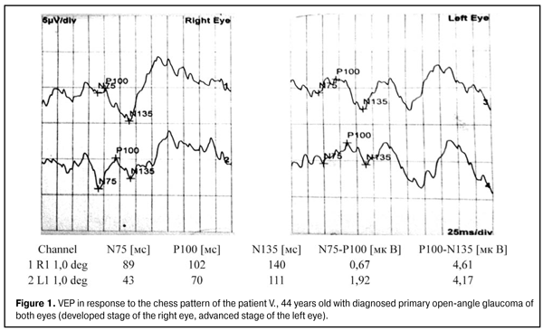 Conclusions Considering the dynamics of changes in the parameters of VEP in response to the chess pattern and flash in patients at different stages of primary open-angle glaucoma, we observe the following: 1. Bioelectric activity of the cerebral cortex, according to the visual evoked potential in response to pattern in patients with suspected glaucoma and early stage during analysis of duration of the latent period respectively in 96.1% and 86.36% of cases statistically significant showed "supernormal" results. And only the patients with developed stage (74.55%) and patients with the advanced stage (84.61% of cases) showed a statistically significant extension of the latent period. 2. Amplitude of fluctuation of the main peaks N75-P100 was significantly higher than normal in 78.61% and 65.15% cases respectively in patients with suspected glaucoma and early stage of primary open-angle glaucoma; patients with developed and advanced stages of glaucoma showed a statistically reliable decrease of the amplitude of fluctuation peaks and change in P100 top peak in W-shaped form. 3. Usage of neurophysiological research methods - visual evoked potentials in response to pattern – is important for confirmation of diagnosis and stage of development of glaucoma for early diagnosis and the choice of further tactics of treatment. References 1. Alekseev VI, Nikitin DI, Gazizova IR. [Changes in the central parts of visual analyzer in case of primary open-angle glaucoma]. Collection of abstracts from research and practice conference “Filatov Readings – 2012”. Odessa. 2012: 95. Russian. 2. Zavgorodnyaya NV, Pasechnikova NV. [Primary glaucoma. Fresh approach to the old problem]. Zaporozhzhye. 2010:192. Russian. 3. Kisseleva OA, Makuha SA, Yakubova AV, Vasilenkova LV. [Examination of eye haemodynamics in patients with primary open angle glaucoma after fistulizing surgery]. Rossiysky oftalmologicheskiy zhurnal. 2014;7(2):94-96. Russian. 4. Lessella S, Van Dalena JTU. [Neuroophthalmology]. Moscow: Meditsina. 1983:99-101. Russian. 5. Moiseenko RA, Golubchikov MV, Slabkiy GO, Rykov SA. et al. [Ophthalmological care in Ukraine in 2006-2011]. Kiev;2:183. Russian. 6. Rykov SA, Vitovskaya OP, Shargorodskaya IV et al. [Unified clinical protocol of medical care. Primary open angle glaucoma. Primary and secondary care]. Order of the Ministry of Health of Ukraine No. 816, dated 24.11.2011. Kiev. 2011:37. Russian. 7. Shamshinova АМ , Andreeva TM. [Clinical physiology of sense of vision]. Moscow. 2006:956. Russian. 8. Alekseev V, Gаzizova I. Meaning of neurodegeneration in the pathogenesis of glaucoma, 11 th EGS Congress. Nice. 2014:60. 9. Berisha F et al. Effect of trabecullctomy on ocular blood flow. Br. J. Ophthalmol. 2005;89 (2):185-8. 10. Hasegawa S, Abe H. Mapping of glaucomatous visual field defects by multifocal VEPs. Inv. Ophthalmol. Vis.Sci. 2001;42:3341–3348. 11. Hood DC, Odel JG, Winn BJ. The multifocal visual evoked potential. J. Neuroophthalmol. 2003;23(4):279-289. 12. Klistorner A, Graham SL. Objective perimetry in glaucoma. Ophthalmol. 2000;107:2283–2299. 13. Klistorner A, Graham SL, Grigg JR. et al. Multifocal topographic visual evoked potential: improving objective detection of local visual field defects. Inv. Ophthalmol. Vis. Sci. 1998;39(6):937 – 950 14. Nesher R, Mimouni M, Epshtein E, Gorck L, Trick C. Reported status OCT retinal nerve fiber Layer thicrness measurements. In: Natsionaln. zhurn. glaukomy. 2014;2(13):11-15. 15. Quigley UA. Glaucoma. Lancet. 2011:16;377(9774):1367–7. 16. Wu De Zheng, Liu Yan Atlas of testind and clinical application for Roland Electrophysiolodikal Instrument. Beigind science and technology Press. China, 2006:5-19.