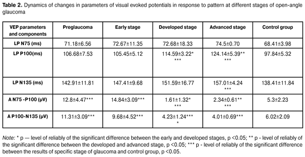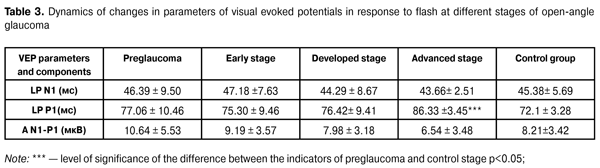 In terms of Mann-Whitney criterion, we observed a statistically reliable difference between the early and developed stages according to the indicators of P100 latent period (Z = 2.33; p = 0.028), P100-N135 peak amplitude (Z = 3.50, p = 0.00046), N75-P100 peak amplitude (Z = 2.04; p = 0.04); between the developed and advanced stages according to the indicator of P100 latent period (Z = 3.08; p = 0.033). According to other investigated indicators of visual evoked potentials in response to flash and pattern according to Mann-Whitney criterion, no reliable statistical differences were found.