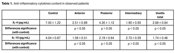 It was found that the most pronounced decrease of interleukin-4 is observed in intermediary uveitis (almost 4 times compared to control group) and the least pronounced in posterior uveitis (1.7 times compared with the control group).