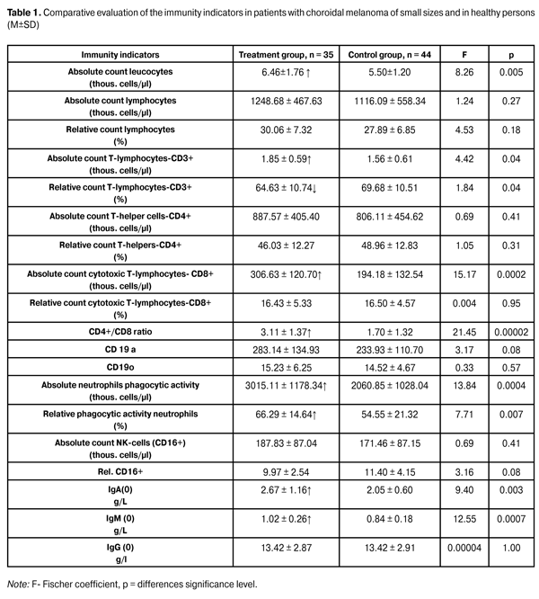 Results. Most indicators of both cellular and humoral immunity in patients with CM of small sizes were higher than in healthy individuals. So CM-patients at the initial stage of the disease in comparison with healthy people had a statistically significant increase of such indicators, as the absolute cells count (by 17.5%, p = 0.005), T-lymphocytes CD3+ absolute count (18.6%, p = 0.04), cytotoxic cells CD8+ absolute count (57.9%, p = 0.002), immunoregulatory index ratio CD4+/CD8+ (82.9%, p = 0.00002), immunoglobulin A (30.2%, p = 0.003) and M (21.4% p = 0.0007). At the same time, there was a statistically significant minor (2.8%, p = 0.04) decrease of the relative count of T-lymphocytes CD3+. This indicates that at the initial stage of UM progression, patient's immune system is active.  An increase of absolute (46.3%, p = 0.0004) and relative (by 21.5%, p = 0.007) phagocytic neutrophils activity also indicates the natural resistance of UM-patients at an early stage of the disease.
