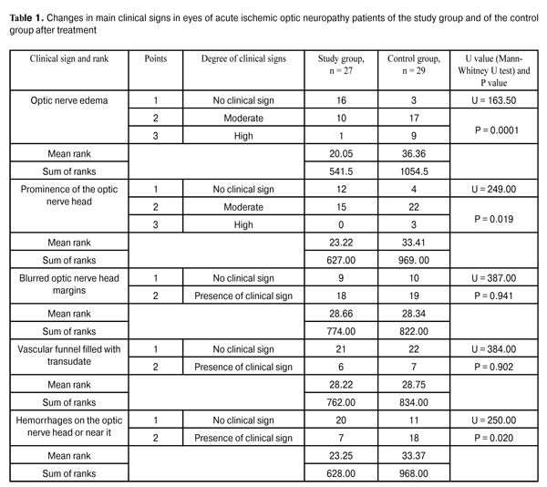 It is noteworthy that the reduction in clinical sign scores for eyes of the study group was far more significant than that for eyes of the control group, which was evidenced by lower mean ranks in the former group. Thus, the optic nerve edema score in the study group was significantly lower than that in the control group (р = 0.0001). Additionally, patients of the study group had significantly less prominence of the ONH (р = 0.019) and a more significant reduction in hemorrhages on the ONH or near it (р = 0.020) compared to these measures in the controls. Table 2 presents the results of Doppler ultrasonography studies of ocular hemodynamics related to the ophthalmic artery in eyes of both groups.