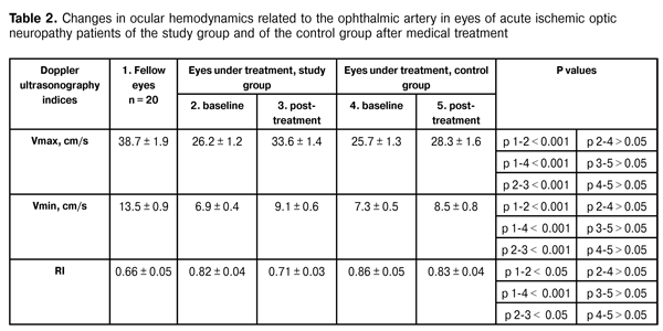 The analysis of the results shows that, mean baseline Vmax value in eyes under investigation was significantly lower than that in fellow eyes ((26.2 ± 1.2) cm/s vs (38.4 ± 1.9) cm/s in patients of the study group and (25.7 ± 1.3) cm/s vs (38.4 ± 1.9) cm/s in patients of the control group, i.e., 32% and 34% lower). Additionally, mean baseline Vmin value in eyes under investigation was also significantly lower than that in fellow eyes (6.9 ± 0.4 cm/s vs 13.5 ± 0.9 cm/s in patients of the study group and 7.3 ± 0.5 cm/s vs 13.5 ± 0.9 cm/s in patients of the control group, i.e., 49% and 46% lower). Moreover, mean baseline RI value in eyes under investigation was significantly higher than that in fellow eyes (0.82 ± 0.04 vs 0.66 ± 0.04 in patients of the study group and 0.86 ± 0.05 vs 0.66 ± 0.04 in patients of the control group, i.e., 24% and 29% lower). The intergroup difference in baseline Doppler ultrasonography indices between study group and controls was found to be insignificant. Following treatment, only intragroup differences in Doppler ultrasonography indices among patients of the study group were found to be significant: mean Vmax value and mean Vmin value increased to 33.6 ± 1.4 cm/s (28%), and 9.1 ± 0.6 cm/s (31%), respectively, whereas RI value decreased to 0.71 (15%). In patients of the control group, these parameters did not change significantly over time of treatment. Therefore, increase in systolic peak velocity and end-diastolic (minimum) velocity in the ophthalmic artery, and decrease in vascular resistance to blood flow demonstrate improvement in posterior ocular blood flow in patients with acute ischemic optic neuropathy treated with adjuvant Vessel due F. Conclusion First, inclusion of adjuvant Vessel due F therapy demonstrated a superior corrective effect on the altered regional ocular hemodynamics, with increase in systolic peak velocity and end-diastolic (minimum) velocity (28% and 31%, respectively) in the ophthalmic artery, and 15% decrease in vascular resistance to blood flow in patients with acute ischemic optic neuropathy. Second, the use of this adjuvant therapeutic agent resulted in improved treatment outcomes, with significant improvement in visual acuity, visual field performance and reduction in the main clinical signs of the disease. References