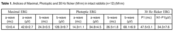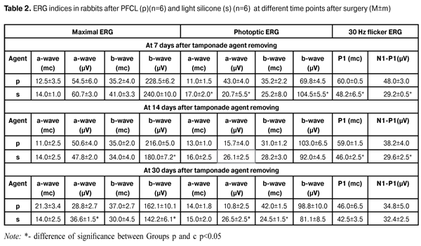 30 Hz flicker ERG response reflects activity of the cone system to 30 Hz stimuli. That in eyes after PFCL tamponade was characterized by increased N1- Р1 (µV) wave amplitude by 65.5% (р=0.001) and longer peak time by 24.4% (р=0.03). 30 Hz flicker ERG didn’t differ from the norm in eyes after SO tamponade (Table 2). High frequency flicker ERG is considered to be a signal reflecting total resulting activity only of neuronal retinal elements not mediated by neuroglia since, according to Miller R.F., Dowling J.E., (1970) [11], glial Muller cells are unable to resolve flickers with a rate higher than 2-4 Hz. Thus, at Day 7 of follow up after tamponading agent removing, action of SO and PFCL resulted in almost similar increased response in photoreceptor and inner layers of the retina by 35-85% and delayed conduction in the inner layers (bipolar and Muller cells) by 58%. However, PFCL effect on the cones was more sparing as compared to that of light SO: SO tamponade resulted in a decrease in cone response, implicit time delay and too high response in the inner layers (by 48%). At Day 14 after tamponading agent removal, the inner retinal layers in the PFCL eyes responded to a flash with a higher b-wave amplitude than in eyes with light SO by 16.6% (р=0.02). So, it was equal to 216±5 (µV) (Table 2). Photoptic ERG didn’t differ significantly in groups; however, b-wave amplitude showed increased reactivity in the inner layers by 43% as compared to the norm (Table 1). 30 Hz flicker responses were recorded with a higher amplitude of N1- Р1 (µV) wave by 22 % (р=0.04); however, as compared to the norm, that didn’t alter significantly in both groups. Only latency was slowed in the neuronal elements of cones by 22% (р=0.001) to (59.0±1.5) mc in PFCL group. Thus, at Day 14 after tamponading agent removal, response was increased in the retinal inner layers (by 16.6% and more in PFCL) as well as in the inner layers of the cones, in both groups. At Day 30, Maximal ERG was actually within the normal range in SO group, only a-wave amplitude decreased by 14% (р=0/04) as compared to the norm. In PFCL group, a-wave amplitude was smaller in Maximal ERG and Photoptic ERG by 27% (р=0.006) and 59% (р=0.001), respectively, as compared to SO group; that was likely a reflection of early dystrophic alterations in the photoreceptors. Flash response of the inner cone layers was characterized by increased activity in both groups; herewith, b-wave amplitudes did not differ significantly (Table 2) and conduction delay was observed after PFCL removal. It should be noted that 30 Hz Flicker ERG was normalized in both groups. Thus, at early terms after tamponading agent (PFCL and SO) removal, rabbit’s retina respond was similar and characterized by actually equal increase in activity of photoreceptor and the inner retinal layers (supernormal ERG). At Day 14, response in the inner retinal layers remained increased in both groups, but with a less amplitude as compared with that at time point of 7 days (Table 2). At Day 30, in both groups, flash response in inner cone layers was still increased with more delayed conduction and decreased amplitude in photoreceptor response in PFCL group. The data on normalization of 30 Hz flicker ERG in both groups showed the safe ability of the retinal neurons to reproduce light rhythm. Conclusions As a result of the experiment, 14 day PFCL (perfluorodecalin) tamponade of the rabbit eyes induced similar bioelectric reaction in the retina, comparing to light SO tamponade (viscosity 5 700 sST). The reaction consisted of increased activity in photoreceptor and inner retinal layers at early terms and normalization of retinal functions at late terms (1 month) after tamponade removing with a decrease in inner layer reactivity. Therefore, PFCL can be considered as a short-term tamponade agent.