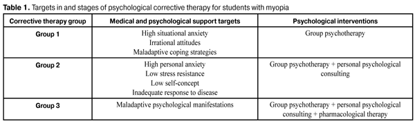 Conclusions The use of the proposed algorithm for psychological support of myopic patients enables effective correction of their psychoemotional status. The procedure is performed in stages, with Stage 1 involving diagnosis of patient’s psychoemotional status (assessment of self-concept, anxiety level, psychic response to disease, presence of irrational attitudes, coping strategies and symptoms of severity of a psychopathologic syndrome), Stage 2 involving determination of targets of and formation of groups for psychological corrective therapy, and Stage 3 involving differential use of cognitive behavioral and rational emotive therapies. The efficacy and duration of therapeutic effect of treatment performed were found to be improved with timely use of repeated psychotherapeutic courses as per indications. References