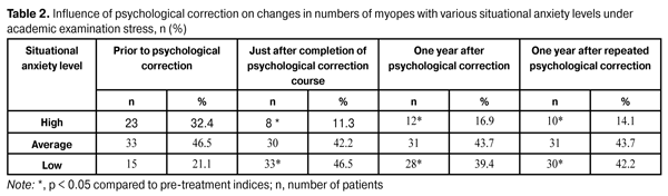 At Stage 3, after a five-month course of therapy, study subjects underwent psychodiagnostic re-testing during the next academic examination period. The results of studies conducted during Stages 1 to 3 have been reported previously [5, 6]. At Stage 4 of clinical observation, one year after completion of Stage 3, students underwent psychoemotional status re-testing using the tools mentioned above. They underwent a repeat course of psychological corrective therapy (if required) based on re-testing results. At Stage 5 of clinical supervision, one year after completion of Stage 4, myopic patients’ psychoemotional status was reassessed. Statistical analysis of the results was performed with the non-parametric tests [16]. Results and Discussion Previously, we have found that (1) psychoemotional features of myopic patients include high situational anxiety, prevalence of irrational attitudes, and low or average self-concept [5], and (2) these patients mostly have an anxious response to disease, tend to maladaptive manifestations of a psychopathologic syndrome, and generally assume non-active coping strategies [6]. Based on these findings, we designed the stages of psychocorrective support of myopic patients, and made an assessment of its efficacy [6]. A year after psychological corrective measures were taken, the number of patients with high situational anxiety under academic examination stress was found to be increased by 50.0% (Table 2). However, this number was statistically significantly reduced from the pre-therapy time point (р <0.05). All myopic patients under observation underwent a repeated course of psychological corrective measures and psychoemotional status re-testing one more year later. With this done, the number of patients with high situational anxiety under academic examination stress was found to be decreased, and was not statistically significantly different from that after the first psychological correction course. These findings suggest that systematic monitoring of myopic patients’ psychoemotional status and timely prescription of a repeated course of psychological corrective measures are essential for the long-term efficacy of psychological corrective therapy.