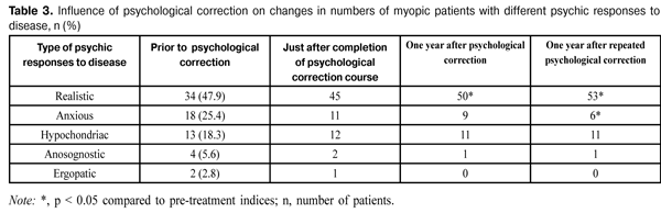 We found situational anxiety scores and patient's psychic response to disease to be interrelated. Thus, after psychological corrective measures were taken, a reduction in the number of patients with an anxious response to disease as well as an increase in that with a realistic response to disease (with patients understanding the condition and demonstrating a responsible attitude to treatment) was observed. One year after completion of the first psychological corrective course, no increase in the number of patients with an anxious response to disease was observed (Table 3). Patient's beliefs that the course of disease is unfavorable (with further progression of myopia), and that the treatment administered is ineffective and cannot stop progression of disease, along with anxiety about possible complications and serious non-compliance with medical treatment are characteristic of this response to disease.