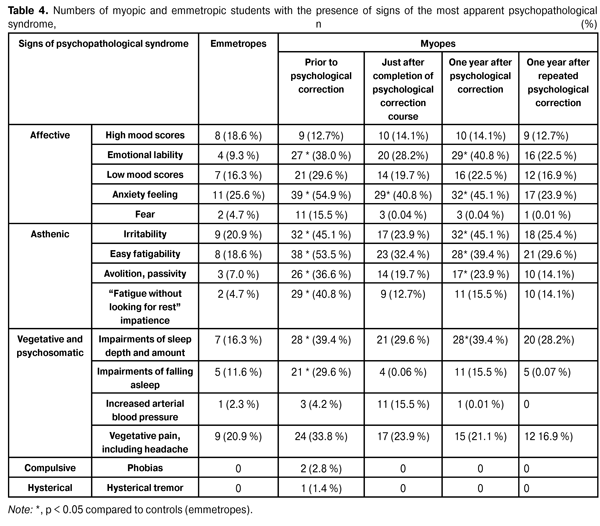 Additionally, we observed a decline in the numbers of patients with hypochondriac, anosognostic, or ergopatic response. The former patients give their minds too much to subjective and other unpleasant sensations (e.g., sensation of decreased visual acuity, especially under high visual load) and are always eager to talk to others about disease symptoms (often seek medical attention for visual acuity re-testing). Patients with anosognostic response to disease reject any thoughts about it and its effects, display a flippant attitude, ignore medical advice, and reject subjecting themselves to regular monitoring of myopia progression. Patients with ergopatic response to disease take a responsible attitude towards their disease and treatment, as well as towards monitoring of disease progression, due to their desire to preserve quality of life. It is possible that a statistically significant decrease in the number of patients with an anxious response to disease, as well as a decline in the numbers of patients with hypochondriac, anosognostic, or ergopatic response is associated with the use of active coping strategies by patients, resulting in reconsideration of the disease by the patient and in an increased belief in favorable outcome. The changes in prevailing coping strategies used by patients of three groups after completion of a series of corrective intervention sessions were also found to be stable. The number of patients using active coping strategies aimed at an individual’s independent problem solving did not change during one year of observation. After one year of observation, the patients were also assessed for signs of a psychopathologic syndrome. It is noteworthy that no compulsive or hysterical signs manifesting a psychopathologic syndrome were found. However, one year after completion of psychological corrective treatment, an increase in the numbers of patients with emotional lability, irritability, fatigue, as well as impaired sleep depth and amount was observed. These abnormalities were removed after taking a repeated course of psychological corrective measures (Table 4).