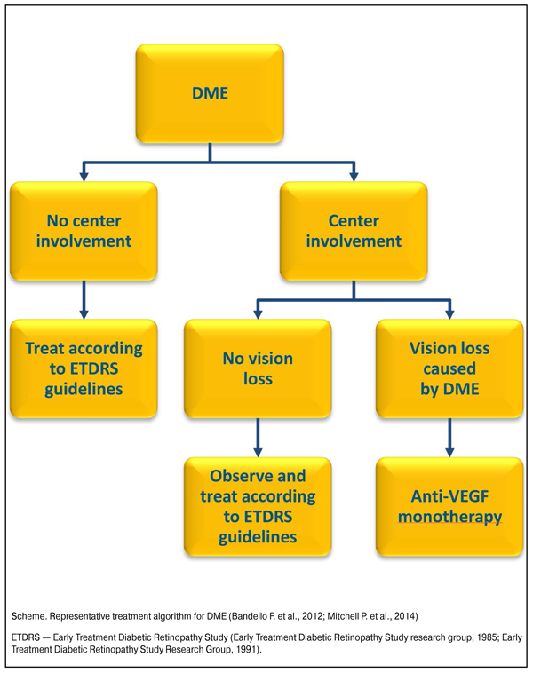 https://doi.org/10.31288/oftalmolzh201634954 Expert Consensus Optimizing management of patients with visual impairments as a result of diabetic macular edema. Role and place of the anti-VEGF-preparation aflibercept Moderator: Katz Todd, MD, Ophthalmologist, Retinal Specialist (New York, USA) Members: Vitovska Oksana P. — Professor, Head of the Ophthalmology Department of the National Medical University, Main ophthalmologist of the Ministry of Health of Ukraine (Kiev, Ukraine) Korol Andrii R. — Doctor of Medical Sciences, The Filatov Institute of Eye Diseases and Tissue Therapy of the National Academy of Medical Sciences (NAMS) of Ukraine, Head of laser department (Odessa, Ukraine) Mankovsky Borys M. — Professor, Corresponding Member of NAMS of Ukraine, Head of the Department of Diabetology of the Shupyk National Medical Academy of Postgraduate Education, Main endocrinologist of the Ministry of Health of Ukraine (Kiev, Ukraine) Naumenko Volodymyr A. — Professor, Deputy Director of The Filatov Institute of Eye Diseases and Tissue Therapy of the NAMS of Ukraine (Odessa, Ukraine) Pasyechnikova Nataliya V. — Professor, Corresponding member of NAMS of Ukraine, Director of The Filatov Institute of Eye Diseases and Tissue Therapy of the NAMS of Ukraine (Odessa, Ukraine) Ciardella Antonio P.— Associate Professor of Ophthalmology, University of Colorado Health Sciences Center, Denver (USA); Director of Ophthalmology, Azienda Ospedaliera-Universitaria, Policlinico (Bologna, Italy) International interdisciplinary symposium of ophthalmologists and endocrinologists and international interdisciplinary advisory board “Optimizing management of patients with visual impairments as a result of diabetic macular edema” took place in Kiev on November 7, 2015. According to the International Diabetes Federation — IDF (2015), some 415 million people worldwide, or 8.8% of adults aged 20-79, are estimated to have diabetes mellitus (DM). About 75% live in low- and middle-income countries. If these trends continue, by 2040, some 642 million people, or one adult in 10, will have diabetes. The largest increases will take place in the regions where developing economies are predominant. IDF also estimates that as many as 193 million people worldwide, or close to half of all people with diabetes (46,5%), are unaware of their disease. Most of these cases are type 2 diabetes. The earlier a person is diagnosed and management of diabetes begins, the better the chances of preventing harmful and costly complications (International Diabetes Federation — IDF, 2015). Diabetic retinopathy (DR) is one of the main microvascular complications of diabetes. The disease is progressive, developing from an initial ‘non-proliferative’ state to pre-proliferative and proliferative disease. Diabetic macular edema (DME) can occur in individuals with any stage of diabetic retinopathy. DR and DME are leading causes of blindness in the working-age population of most developed countries (Ciulla T.A. et al., 2003). Data of the prevalence of DME can vary widely. According to some estimations DME may affect ~7% of people with diabetes, and ~23% patients with DR (Ding J., Wong T.Y., 2012; Yau J.W. et al., 2012). As the global prevalence of diabetes is expected to rise significantly, the burden of DME will increase proportionately. Vision loss from DR/DME can have a significant impact on quality of life and the ability to perform daily activities and, importantly, may also compromise the ability of the patient to manage their underlying diabetes. According to some studies, visual loss is the main worry in diabetic patients (Coyne K.S. et al., 2004; Luckie R. et al.; DARTS/MEMO Collaboration, 2007). In patients with diabetes, the primary mechanism responsible for vision loss is centrally involved DME or clinically significant macular edema. The risk of developing visual loss increases as retinopathy becomes more severe, also because the incidence of DME increases. Approximately one third of persons with clinically significant macular edema who are untreated have a significant loss of central vision within 3 years (Davidson J.A. et al., 2007). Many healthcare systems in developed countries have established approaches to ensure regular screening for DR, typically with annual retinal examinations and/or fundus photography. The results from such screening may prompt specialist management with varying degrees of urgency. Control of glycaemia, dyslipidemia and hypertension is essential for the management of diabetes, and is associated with the prevention and delay of onset of diabetes-related macrovascular and microvascular complications. Although well-managed diabetes can reduce the risk of developing or slow the progression of macro- and microvascular complications, even patients with good control of their disease often develop ophthalmic complications such as DR and DME. Laser photocoagulation (focal, grid or panretinal) have been widely recommended as the standard of care for DR/DME since the 1980s. At present, for mild-to-moderate non-proliferative DR in the absence of any clinically significant DME, ongoing monitoring and no treatment is usually recommended. In proliferative DR, active laser treatment is indicated to prevent further progression of the disease. Pan-retinal laser photocoagulation may be recommended as soon as proliferative disease is detected, to prevent vision loss and the need for vitrectomy (American Academy of Ophthalmology Retina/Vitreous Panel, 2014; International Council of Ophthalmology, 2014). In DME laser photocoagulation may be effective at stabilizing vision, but does not result in a gain in vision. In addition, laser is not without side effects. Foveal burns, visual field defects, retinal fibrosis and laser scars have been reported (Ford J.A. et al., 2013). Intravitreal corticosteroid use considered as alternative to laser photocoagulation; however, mixed results in randomized, controlled trials and sig