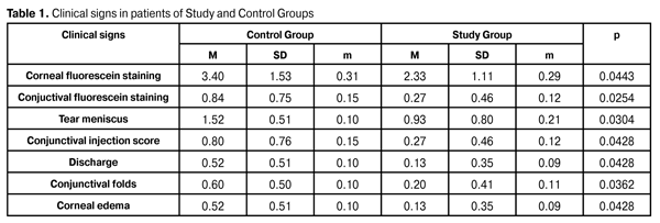 It should be noted that tear break-up time in Control and Study groups was (5.24±0.19) s and (6.13±0.32) s, respectively, (р<0.05).
