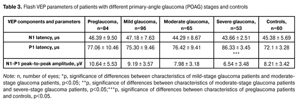 In addition, patients underwent a neurophysiological study involving pattern and flash VEP tests. VEP data were obtained with the multifocal (mf) ERG and VEP RETIscan system (Roland Consult, Wiesbaden, Germany). We recorded changes in (1) pattern VEP latencies of N75, P100, and N135 and amplitudes of N75-P100 and P100-N75, and (2) flash VEP latencies of N1 and P1 and amplitudes of N1-P1 to characterize VEP dynamics and pathological processes. The study group (156 patients; 298 eyes) was retrospectively subdivided into preglaucoma-stage (42 patients; 84 eyes), mild-stage glaucoma (48 patients; 96 eyes), moderate-stage glaucoma (36 patients; 65 eyes), and severe-stage glaucoma (30 patients; 53 eyes) subgroups based on the degree of POAG severity. The preglaucoma subgroup comprised patients with two of the following parameters being abnormal: those of ocular rheography, OCT evidence of inter-eye difference in cup width of more than 20%, inter-eye or daily difference in IOP of more than 3-4 mm, presence of clinically significant POAG in the fellow eye and presence of a genetic history of glaucoma. Exclusion criteria included: absolute glaucoma, high emmetropia, optic nerve disease, macular dystrophy, hypertonic retinopathy, optic media opacity, diabetes mellitus, cranial trauma, and acute and chronic brain circulation disorders. Since no standards for normal values of VEP measurements have been established in clinical practice, VEP data of POAG patients were compared with those of controls as well as with literature data [10] and those supplied by the manufacturers. Statistical analysis was performed with Statistica 10 software (Statsoft, Tulsa, OK) and involved the use of pairwise Student t test and nonparametric Spearman correlation. P < 0.05 was considered significant. Results and Discussion Table 2 presents clinical characteristics of the study group and control group which were used as criteria for the diagnosis and course of the disease. Statistically significant differences in IOP, cup width, and Humphrey parameters were found between patients with moderate and those with severe disease (Table 2). A statistically significant difference between the mild disease subgroup and the moderate disease subgroup as well as between the former and the control group was found only in Humphrey parameters. There were no statistically significant differences in any parameter studied between patients with preglaucoma and those with mild disease, as well as between the former and the controls.