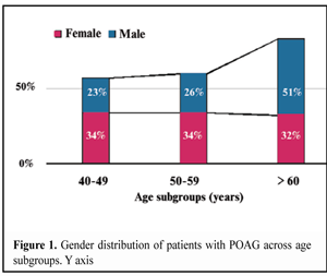 https://doi.org/10.31288/oftalmolzh201641519 Gender- and age-related features of the association between TP53 Pro72Arg polymorphism and primary open-angle glaucoma S.Iu. Mogilevskyy1, Dr Sc (Med), Prof. S.V. Ziablitsev2, Dr Sc (Med), Prof. L. I. Denisiuk1, Assistant 1Ophthalmology Department, Shupik National Medical Academy of Postgraduate Education, Ministry of Public Health of Ukraine 2Pathophysiology Department, Bohomolets National Medical University, Ministry of Public Health of Ukraine Odessa, Ukraine E-mail: sergey.mogilevskyy@gmail.com Background: The TP53 gene is directly related to the development of primary open-angle glaucoma (POAG). There have been inconsistent reports regarding increased risk of POAG and the C allele (72Pro) of the TP53 codon 72 polymorphism. Purpose: To identify associations, if any, between TP53 Pro72Arg polymorphism and presence of POAG in patients of different genders and age groups. Materials and Methods: The study group comprised 172 patients (78 men (45%) and 94 (55 %) women) diagnosed with POAG, and the control group comprised 98 individuals (46 men (47 %) and 52 women (53 %)) without POAG. The mean age of study participants was 57.3±1.1 years at the time of the examination for POAG. Results: In males with POAG, the frequencies of the 72Pro allele and of the Pro72Pro genotype of the ТР53 gene were found to be increased (1.4 times, р = 0.014 and 2.2 times, р = 0.039, respectively) compared to the relevant controls. The presence of the 72Pro allele in males (as well as in females) was associated with POAG. Male carriers of the 72Pro allele had a 1.87 (p (?2) = 0.021) times higher risk for the disease. Elevated frequencies of the 72Pro allele and the Pro72Pro genotype of TP53 codon 72 polymorphism were specific for POAG males older than 60 years, which had a 2.786 times higher risk for the disease (p (?2) = 0.019) compared to the relevant controls. Elevated frequency of the 72Pro allele, as well as decreased frequency of the 72Arg allele was more specific for POAG females younger than 60 years compared to the relevant controls. Female 72Pro allele carriers younger than 60 years had a 2.30 (p (?2) = 0.034) times higher risk for the disease compared to the relevant controls. Conclusions: The presence of the 72Pro allele in males was associated with POAG. POAG males older than 60 years had a 2.786 times higher risk for the disease compared to the relevant controls. The presence of the 72Pro allele in females was associated with POAG. Female 72Pro allele carriers younger than 60 years had a 2.30 times higher risk for the disease compared to the relevant controls. Key words: primary open-angle glaucoma, TP53 Pro72Arg polymorphism, gender, age Introduction Oxidative stress and apoptotic damage to the third retinal neuron play a special role in primary open-angle glaucoma (POAG), which is a multifactorial disease with a threshold effect [1]. Metabolic disorders, hypoxia and excessive IOP contribute significantly to the triggering of the apoptosis of retinal neurons [2]. Glaucoma affects individuals of both genders and different age groups. The incidence of POAG in males exceeds that in females by a factor of 3; however, low tension glaucoma prevails in women, with a women/men ratio of 2:1 [3, 4]. The prevalence of POAG has been reported [1] to be to as low as 0.1% in people 40-49 years of age, rising to as much as 14.3% in those over 80 years of age; the yearly incidence of glaucoma per 1,000 individuals aged 40 to 45 is approximately 1. The TP53 gene is one of the numerous hereditary and genetic factors resulting in the development of POAG, and is directly related to this development [5]. Since the gene codes the protein, p53, its expression is directly related to the implementation of apoptotic features of this protein. In recent years, as a potential candidate susceptibility gene for glaucoma, TP53 polymorphisms have attracted much attention in the medical community, and have been investigated in different populations. Although the number of known TP53 polymorphisms is more than 30, of the most significance for POAG is a single nucleotide polymorphism (SNP) in exon 4 of p53 at codon 72, a substitution of cytosine for guanine (Arg72Pro) [2, 5, 6]. The role of p53 in initiation of apoptosis is to transcriptionally activate proapoptotic proteins Вах, Noxa, p53AIP1 and Puma, which promote cytochrome c release from mitochondria and repression of antiapoptotic protein Bcl2 [6]. Another possible mechanism of the initiation of apoptosis induced by p53 involves an increase in intracellular free radical oxygen species due to activation of the genes involved in the regulation of cellular redox balance (PIG3, PIG8, FDXR) [6]. Therefore, in a neurodegenerative disease (particularly in POAG), apoptosis may result from cellular stress response and activation of the TP53 gene, and the genetic variability of this gene is of significant importance with regard to neuronal loss. Although some studies have suggested that the C allele (72Pro) [1, 3, 6, 8, 9], or, to the contrary, the proapoptotic allele G (72Arg) [2] of p53 codon 72 polymorphism is associated with POAG, other studies have reported on the lack of association between p53 gene polymorphisms and POAG [4, 9, 10, 11], which may depend on the age at which the disease manifests and between male and female patients. Therefore, of urgent importance is to elucidate the impact of TP53 polymorphism on individuals of different genders and age groups of Ukrainian population, given that in this population, such investigations have not yet been conducted. The study purpose was to identify associations, if any, between TP53 Pro72Arg polymorphism and presence of POAG in patients of different genders and age groups. Materials and Methods The study group comprised 172 patients diagnosed with POAG, and the control group comprised 98 individuals without POAG, the two groups being comparable in terms of female-to-male percentag