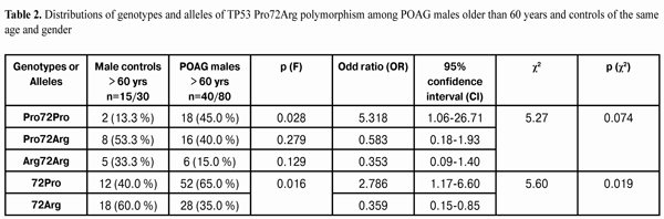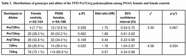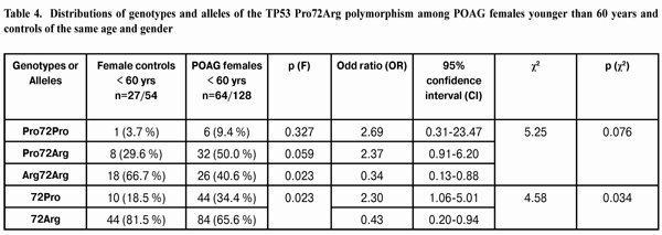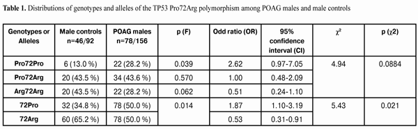 Thus, the frequency of the Pro72Pro genotype and the frequency of heterozygous genotype Pro72Arg in POAG females younger than 60 years were found to be 2.5 times and 1.7 times, respectively, as high as those in female controls of the same age, but these differences were statistically insignificant (p(F) = 0.327 and p (F) = 0.059, respectively). However, the frequency of the Arg72Arg genotype in POAG females younger than 60 years was found to be 1.6 times as low as that in female controls of the same age, and this difference was statistically significant (p(F) = 0.023). The distribution of genotypes among females younger than 60 years was not associated with POAG (р (?2) = 0.076). The distribution of alleles of the polymorphism under investigation was statistically different between POAG females younger than 60 years and female controls of the same age (Table 4). The 72Pro allele was found 1.9 times more frequently in study group females than in female controls (34.4% versus 18.5%, respectively). The 72Arg allele was found (1.2 times) significantly less frequently in study group females than in female controls (65.6% versus 81.5%, respectively; р (F) = 0.023). The distribution of alleles was found to be associated with POAG, i.e. female 72Pro allele carriers younger than 60 years had a 2.30 (CI=1.06-5.01; p (?2) = 0.034 ) times higher risk for the disease compared to the relevant controls. Female 79Arg allele carriers younger than 60 years, correspondingly, had a 2.30 times lower risk for the disease compared to the relevant controls. Analysis of the data obtained showed no significant difference in the distribution of genotype and allele frequencies between POAG females and female controls older than 60 years. Therefore, the phenomenon demonstrated above (that of a higher frequency of the 72Pro allele and a lower frequency of the 72Arg allele in POAG group females compared to those in control group females) was related mostly to females younger than 60 years. Conclusions First, in the presence of POAG in males, the frequencies of the 72Pro allele and of the Pro72Pro genotype of the ТР53 gene were found to be (1.4 times, р=0.014 and 2.2 times, р=0.039, respectively) increased. The presence of the 72Pro allele in males was associated with POAG, and male carriers of the 72Pro allele had a 1.87 times higher risk for the disease (p (?2) = 0.021). Analysis of the distributions of genotypes and alleles and of their associations with the development of POAG in males showed that, elevated frequencies of the 72Pro allele and the Pro72Pro genotype of TP53 codon 72 polymorphism was specific for POAG males older than 60 years, which had a 2.786 times higher risk for the disease (p (?2) = 0.019) compared to the relevant controls. Second, the presence of the 72Pro allele in females (similar to its presence in males) was associated with POAG. Analysis of the distributions of genotypes and alleles and of their associations with the development of POAG in females showed that, elevated frequency of the 72Pro allele, as well as decreased frequency of the 72Arg allele of TP53 codon 72 polymorphism was more specific for POAG females younger than 60 years compared to the relevant controls. Female 72Pro allele carriers younger than 60 years had a 2.30 (p (?2) = 0.034) times higher risk for the disease compared to the relevant controls.