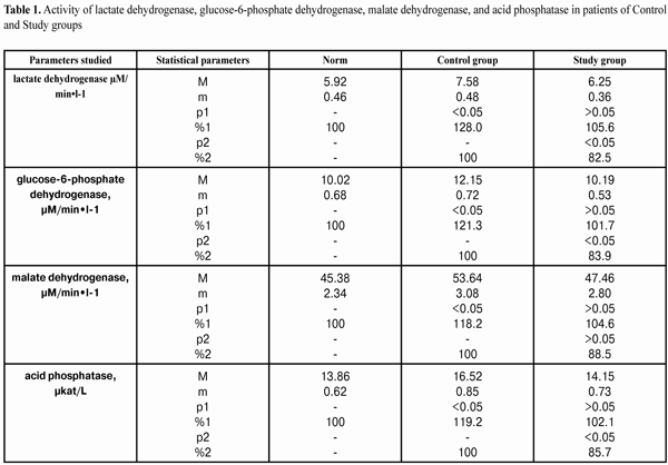 LD activity in the tear fluid in Control group patients was increased up to (7.58±0.48) µM/min•l-1 as compared with norm (5.92±0.46) µM/min•l-1, e.g. by 128.0%. In Study group patients, LD activity was decreased by 17.5% as compared with that in Control group (p<0.05). Activity of G-6-PD, MDH and ACP activity in Study group patients decreased by 16.1%, 11.5%, and 14.3% , respectively, as compared with that in Control group (p<0.05). The content of protein thiol groups in the tear fluid decreased by 82.0% in the Control group patients and was equal to (80.78±5.02) µM/l, vs (98.54±6.20) µM/l of the norm. In the Study group, thiol proteins decreased by 92.2% as compared to the norm and equaled (90.87±5.16) µM/l. Thus, when using hyaluronate, the content of thiol groups did not change significantly as compared with the Control group (р>0.05). The content of protein disulfide groups increased by 128.9% in the Control group and equaled (34.46±2.40) µM/l vs. (26.73±1.57) µM/l of the norm. In the Study group, disulfide group content increased insignificantly equaling (27.86±1.87) µM/l. Thus, when using hyaluronate, the content of disulfide groups decreased by 19.2% comparing with the Control group (р>0.05). Generally, data obtained when studying enzyme activity in the tear fluid of patients receiving hyaluronate instillations in addition to BAC eye drops indicate clearly the membrane-stabilizing action of hyaluronate. Thus, activity indices of cytosolic, mitochondrial and lysosomal enzymes in the tear fluid of the Study group patients receiving hyaluronate were significantly higher than those in patients of the Control group receiving no hyaluronate but BAC drops only. Meanwhile, hyaluronate did not influence significantly on reduced glutathione level in the tear, decreasing markedly the content of oxidized coenzyme. Therefore, we can suggest that direct antioxidant action of hyaluronate plays the main role in its benefit for anterior segment tissues under the conditions of using BAC-containing eye drops. Conclusions 1.Using hyaluronate in patients receiving BAC-containing antiglaucoma drugs has been shown to prevent destabilization of anterior segment membrane structure tissues. This is evidenced by clear decrease in activity level of corresponding enzyme markers in the tear fluid. 2.When using hyaluronate in patients receiving BAC-containing drops, thiol level in the tear fluid does not change significantly; this is the evidence of direct membrane trophic protective activity of hyaluronate from detergent action of the preservative. References 1.Ivanova NV. [Preservatives in topic therapy of eye diseases: advantages and disadvantages]. Oftalmologiia. Vostochnaia Evropa. 2013.1(6):2-7. In Russian. 2.Ayaki M, Yaguchi S, Iwasawa A. Cytotoxicity of ophthalmic solution with and without preservatives to human corneal endothelial cells, epithelial cells and conjunctival epithelial cells. Clin. Exp. Ophthalmol. 2008;36:553-9. 3.Barki WH, M.Tahir. Effects of topical benzalkonium chloride on corneal epithelium. Biomedica. 2007; 23:65-70. 4.Lebedev OI, Kalizhnikova EA, Yavorsky AE. [Mechanisms of action and effects of the benzalkonium chloride on eye tissues]. Russkii med. zhurn. 2013(2): 63-5. In Russian. 5.Ammar DA, Noecker RJ, Kahook MY. Effects of benzalkonium chloride-preserved, polyquad-preserved, and sofZia-preserved topical glaucoma medications on human ocular epithelial cells. Adv. Ther. 2010; 27: 1-9. 6.Gaidamaka TB, Senishin VI. [Influence of the benzalkonium chloride on the oxidative-restored enzymes in the tissues of the anterior section of the eye]. Oftalmol Zh. 2013; 5: 61-6. In Russian. 7.Gaidamaka TB, Senishin VI. [Influence of the eye drop preservatives on the restorative potential of glutathione in the tissues of the anterior section of the eye]. Oftalmol Zh.2012;6:96-100. In Russian. 8.[New methods of biochemical analyses]. Izd. Leningradskogo univer.; 1991. 395 p. In Russian. 9.Nasledov A. [SPSS computer analysis of data in psychology and social studies]. St.-Petersburg: Piter Publ. 2005:416. In Russian.