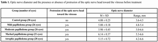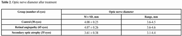 We compared the groups for the post-treatment diameter of subarachnoid space surrounding the optic nerve. The difference in the optic nerve diameter between atrophic and control eyes as well as between atrophic eyes and those of patients with retinal angiopathy was found to be statistically significant (p < 0.05). No statistically significant difference in the optic nerve diameter was found between the eyes of patients with retinal angiopathy and controls (р > 0.05). The results obtained provide evidence that optic nerve diameter approaches the normal range with the regression of papilledema, and decreases with the development of secondary optic atrophy, which requires for further study. Conclusions In conclusion, the optic nerve head protrudes into the vitreous and perioptic subarachnoid space increases in diameter to more than 4.8 mm based on ultrasound, with the development of papilledema secondary to IIH. The amount of increase in optic disc diameter in patients with IIH depends on the degree of optic nerve swelling. ONUS is an accurate, fast, non-invasive and economical diagnostic technique for the detection of raised intracranial pressure and provides for case monitoring in IIH.