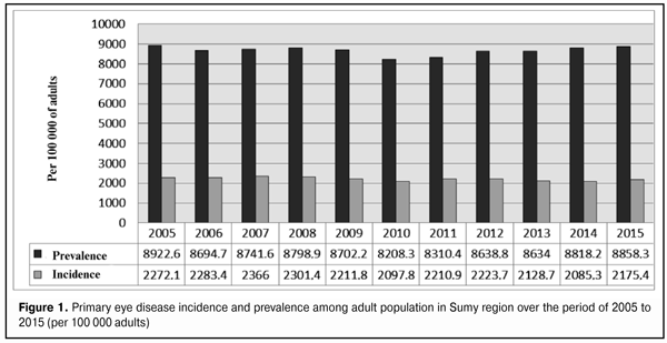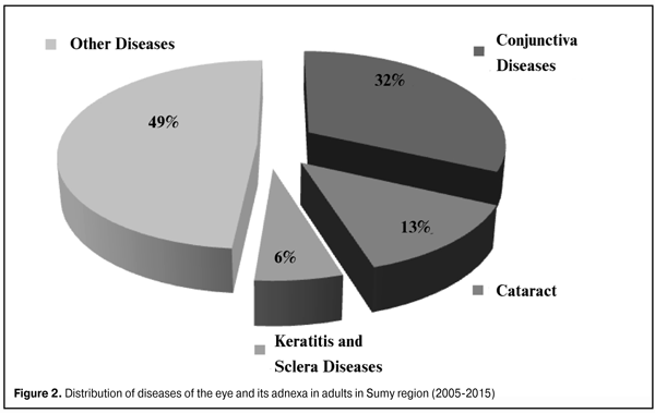 Results and Discussion Using the materials of the official statistics, we analyzed the indices of incidence and prevalence of primary disease of the eye and its adnexa among adult population in Sumy region over the period of 2005 to 2015. Figure 1 demonstrates that over 10-year period, the primary disease incidence indices decreased insignificantly from 2 272.11 in 2005 to 2 175.38 in 2015 (per 100 000 adults). The highest and the lowest rates were noted in 2007 and 2014, respectively, and were 2 365.98 and 2 085.98 per 100 000 adults, respectively. Among all the primary diseases of the eye and its adnexa, a third was comprised by conjunctivitis (31.84%); every seventh had cataract (13.29%) (Fig. 2).