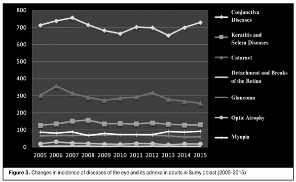 Conversely, conjunctiva disease prevalence rates decreased in most districts (12) as compared to the year of 2005, especially in Hlukhivskyi, Burynskyi, and Velyko-Pysarivskyi where fall was by 71.94%, 42.97%, and 27.09%, respectively. However, in Seredyno-Buds'kyi, Lypovodolynskyi, and Sums'kyi districts prevalence increased by 91.02%, 60.21%, and 54.73%, respectively. Another frequent nosological entity was cataract which was newly diagnosed in 256.23 per 100 000 adults in 2015. Throughout the studying, we observed wavy changes with a common tendency to decrease in incidence rates comparing to the year of 2005. The high disease incidence rates were common for Hlukhivskyi, Lypovodolynskyi, and Lebedynskyi districts. At the same time, the lowest rates as for 2015 were in Yampilskyi and Shostkynskyi districts. Cataract prevalence from 2005 to 2015 increased in twelve districts. The maximum growth rate throughout the period of observation was noted in Seredyno-Buds'kyi and Lebedynskyi districts, i.e. (36.29±27.40%) and (25.47±11.67%), respectively. The minimal growth rate, (4.39±3.69%), was in Konotopskyi district. As for myopia incidence, its dynamics was characterized with a stable tendency to annual increase. Thus, the incidence rate per 100 000 adults was 87.82 in 2007, it increased to 88.48 and 90.16 in 2007 and 2013, respectively, reached 92.60 in 2015. The maximal growth rates were in Okhtyrskyi, Bilopilskyi, and Nedryhailivskyi districts, i.e. by 84.45%, 58.68%, and 55.73%, respectively; the minimal ones were in Yampilskyi and Burynskyi districts, where the incidence rates decreased by 91.45% and 81.78%, respectively. Unlike the incidence, the prevalence rates decreased for myopia. This index in 2015 was lower than that in 2005 by 7.6% due to Shostkynskyi, Yampilskyi, Burynskyi, Velyko-Pysarivskyi, Krolevetskyi, and Lebedynskyi districts. Comparing to the year of 2005, the prevalence rates increased twice in Krasnopilskyi, Okhtyrskyi, Sums'kyi , and Seredyno-Buds'kyi districts. Analyzing the incidence and prevalence for glaucoma, we noted both a decrease in its primary registration by 8.82% (from 65.5 to 59.72 per 100 000 adults) and an increase in its prevalence by 31.38% (from 693.32 to 910.95 per 100 000 adults) within 2005 to 2015. The most significant decrease in glaucoma incidence rates was observed in Velyko-Pysarivskyi and Yampilskyi districts, by 70.14% and 54.14%, respectively. The incidence growth was intensive in Seredyno-Buds'kyi, Lebedynskyi, and Hlukhivskyi districts, (50.6±24.05%), (23.19±15.83%), and (34.13±23.42%), respectively. Consistently high rates of the disease were recorded in almost all districts. The highest glaucoma prevalence rates were observed in Lypovodolynskyi and Lebedynskyi districts, the lowest ones were in Velyko-Pysarivskyi, Bilopilskyi, and Yampilskyi districts. The incidence of newly diagnosed diseases of the sclera and the cornea changed little, if at all, during the whole period and ranged within 127 to 130 cases per 100 000 adults. The average annual increase comprised (12.81±5.93) %. It should be noted that within 2005 to 2015 scleral and corneal disease incidence rates in Romenskyi, Lebedynskyi, and Lypovodolynskyi districts were 10 times higher than those in Konotopskyi, Bilopilskyi, Trostianetskyi, Nedryhailivskyi, and Seredyno-Buds'kyi districts (p<0.05). The prevalence of this group of diseases had the same tendency. The highest rates were noted in Romenskyi, Lebedynskyi, Yampilskyi districts while the lowest ones were in Bilopilskyi, Nedryhailivskyi, and Putyvlskyi districts. Over the last ten years, optic atrophy incidence was of unstable nature with the highest peaks in 2006, 2007, and 2011, i.e. 30.77, 22.59, and 21.09, respectively, per 100 000 adults; the lowest indices were 17.16, 15.86, and 13.19 per 100 000 adults per 100 000 adults in 2009, 2010, and 2013, respectively. As for 2015, this disease incidence was 18.5 per 100 000 adults. The highest rates of the newly diagnosed cases in 2015 were recorded in Hlukhivskyi, Nedryhailivskyi, Burynskyi, and Krasnopilskyi districts, the lowest rates were in Sums'kyi, Konotopskyi, and Bilopilskyi districts. Attention should be drawn to Krolevetskyi district since there was not a single patient with optic atrophy over the last three years (2013 to 2015). The prevalence of optic atrophy (OA) throughout the period increased by 12.13 %: 170.82 in 2005 vs. 194.39 in 2015, per 100 000 adults. OA prevalence rates decreased only in 6 districts, in particular, by 12.2% in Shostkynskyi district and by 72.4% in Bilopilskyi district. In the rest of districts this parameter increased; and the highest rates were in Hlukhivskyi district where average annual growth equaled (22.20±11.75) %. Primary registration of cases with retinal detachment was much variable over the last 10 years. First, we observed incidence growth from 4.03 to 5.9 cases within 2005 to 2010; afterwards it decreased to 3.81 in 2015. Constantly high incidence rates were noted in Burynskyi district, average annual growth of which equaled 14.09%. The prevalence of this pathology, in contrast, increased each year by an average of 5.85%. In 2015, its highest and lowest rates were in Burynskyi and Seredyno-Buds'kyi districts, respectively. Conclusions It was found that over the period from 2005 to 2015 the incidence of the newly diagnosed diseases of the eye and its adnexa decreased in Sumy region’s adults by 4.26 % against the background of unstable prevalence rates which decreased by 8% from 2005 to 2010 and, afterwards, returned rabidly to the 2005 rates. The first, second and third places in the distribution of the newly diagnosed eye diseases among Sumy region adults took conjunctival diseases, cataract, and keratitis and scleral diseases, respectively. As for 2015, the highest rates of eye disease incidence by selected nosologies were recorded in Lypovodolynskyi (diseases of the conjunctiva, keratitis, and sclera disease
