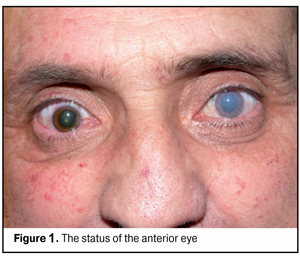 Background: Takayasu’s arteritis is a non-specific autoimmune disease affecting large-size blood vessels, with a predilection for the aorta and its major branches. The most characteristic symptoms include absence or decrease of arterial pulses in the arms and CNS-related abnormalities (arm numbness, pain and paresthesia; fatigue; dizziness; syncope; seizures; aphasia; and hemipareses). Purpose: To exemplify the ocular manifestations of Takayasu disease. Materials and Methods: The patient underwent general clinical tests, comprehensive ophthalmological examination, duplex Doppler sonography of carotid and cerebral vessels, and brain MRI. Results and Conclusion: Our case report demonstrates the severity of the course of the disease and that the prognosis for vision and life in patients with Takayasu's arteritis can be unfavorable. Takayasu's arteritis can be seen in young men, with one of the symptoms being ocular alterations (corneal edema, mydriatic pupil, cataract, changes in retinal vessel caliber, retinal edema and ischemia, and reduced blood flow velocity in the ophthalmic artery). Key words: Takayasu’s arteritis, aorto-arteritis Introduction Takayasu disease (or non-specific aorto-arteritis, or Takayasu's arteritis (TA)) is a non-specific autoimmune disease affecting large-size blood vessels, with a predilection for the aorta and its major branches. Takayasu was the first to report cases of the disease in 1908 and coined the term “non-specific aorto-arteritis”. The incidence of TA has been reported to be 2.4/million/year [1], with a predominance in women (especially under 40 years of age), and has tended to increase in recent years. The etiology of TA is still not fully understood. Previously, the disease was believed to have been caused by bacillus Kochii, and was identified in patients with different forms of tuberculosis. Subsequently, it was hypothesized that rheumatoid arthritis has a role in the development of the disease. Currently, it is believed that TA is an autoimmune disease that develops as a result of changes in the body response to different external and internal stimuli, and of contact with domestic and professional allergens, with a subsequent injury to major arteries. Panarteriitis is characterized by infiltration with dendritic cells, T cells, natural killers and macrophages. Chronic vascular inflammation leads to vessel stenosis, thrombosis and aneurysms. The late phases of the disease are characterized by intimal proliferation, and by increased risk of atherosclerosis, necrosis, focal cicatrization and adventitial fibrosis. The pathomorphological picture corresponds to that in systemic autoimmune connective tissue disorders. The morphological picture of aorto-arteritis depends on the stage of the disease (i.e., varies from acute inflammation phase to scarring). Based on the location of the involved arteries, TA is divided into Type I (involving the aortic arch and its branches), Type II (involving thoracoabdominal aorta and its branches), Type III involving the entire aorta, and Type IV involving pulmonary artery with any of the other types. Unlike the other systemic vasculitides, TA is not characterized by the development of fibrotic necrosis. Narrowing of the coronary arteries in TA usually occurs at origins, often with damage to the left major coronary artery. Stenoses develop in pulmonary arteries, and some of these vessels may show recanalization. Post-inflammatory sclerosis of the aortic intima results in the development of severe secondary atherosclerosis. Clinical picture The most characteristic symptoms include absence or decrease of arterial pulses in the arms and CNS-related abnormalities (arm numbness, pain and paresthesia; fatigue; dizziness; syncope; seizures; aphasia; hemipareses). The ocular symptoms occur when supra-aortal arteries are involved, and ocular symptomatology may be the most prominent. Patients complain of ocular pain and gradual worsening of vision. Fundus examination usually reveals uneven narrowing of the arteries, widening of the veins, retinal edema, thrombosis of individual retinal vein branches, and hemorrhages. Arterio-venous anastomosis and neovascularization are sometimes observed. The late stage is characterized by the development of proliferative retinitis. The possible alterations in the anterior eye include corneal degeneration and cataract. Narrowing of the palpebral fissure and ptosis are sometimes noted. Treatment Corticosteroids (prednisolone) are the mainstay of anti-inflammatory treatment. Patients not responding to corticosteroids can be treated with immunomodulators, including methrotrexate, cyclosporine, cyclophosphamide and azathioprine (imuran). Regular blood pressure monitoring is important since patients treated for TA are at increased risk for the development of hypertension. Prognosis The patient’s condition usually remains satisfactory for long due to the development of collateral circulation. The prognosis is worsened if, besides the aorta, the retina is also affected, and aneurysm develops. Stroke, myocardial infarction and rupture of an aortic aneurysm are the main causes of death in TA patients. To the best of our knowledge, there are few reports in the national medical literature regarding the ocular manifestations of Takayasu disease. Therefore, the aim of this case report was to exemplify the ocular manifestations of Takayasu disease. Materials and Methods Mr M, a 46-year-old man, presented at the emergency room of the Regional Ocular Trauma Center with complaints of sudden severe intolerable pain in both eyes, redness of eyes and loss of vision. Nine years before, he had been diagnosed with Takayasu disease, for which he had undergone amputation of both legs at mid-thigh. The patient underwent general clinical tests, visual acuity assessment, tonometry, ophthalmoscopy, biomicroscopy, perimetry, and anterior eye photography. In addition, he was referred to vascular surgeon, hematologist,