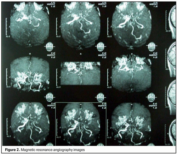 Findings of auxiliary clinical examinations: Complete blood count and urine examination were normal. The Duke's bleeding time was normal (210 s). EEG: the principal rhythm was sinus; heart rate, 62/min; no axis deviation; left ventricular hypertrophy. Findings of duplex Doppler sonography of carotid and cerebral vessels: The blood flow velocity in ophthalmic artery was substantially reduced on both sides. In addition, the size of the common carotid arteries was within the normal range, and the sonograms of common carotid arteries showed marked thickening (due to calcification) with inhomogeneous echogenicity. Multiple atherosclerotic plaques were visible in the right common and right internal carotid arteries. The blood flow velocity in the distal portion of the right internal carotid artery was reduced (distal stenosis). The diameter of the left vertebral artery was 3.4 mm, and there was no blood flow detected in the artery. The blood flow velocity in the internal carotid artery and in the right vertebral artery was reduced. The opinion formulated based on ultrasonography was as follows: ultrasonographic evidence of atherosclerotic disease involving brachiocerebral vessels. Brain MRI findings: A series of axial, saggital and frontal brain MRI images demonstrated no displacement of midline structures, no enlargement of the ventricular system, no changes in chiasmatic-sellar region, multiple intensive periventricular and subcortical foci, no changes in craniovertebral ligaments and in orbital coni, and free paranasal sinuses. Magnetic resonance angiography (MRA) demonstrated a poor vascular pattern, markedly reduced signal from the right carotid artery, elongated vertebral arteries, and reduced signal from the vertebral and communication arteries (more substantially, on the left). The opinion formulated based on brain MRI/MRA was as follows: discirculatory encephalopathy with marked manifestations of vertebrobasilar insufficiency (Fig. 2).