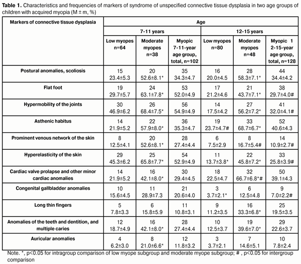 However, there were differences among moderate myopes of the age groups for the rates of cardiac manifestations of connective tissue dysplasia. Thus, prominent venous network of the skin was 3.1-fold more common among junior moderate myopes than among older moderate myopes, whereas cardiac valve prolapse and other minor cardiac anomalies were statistically significantly more common among the latter than among the former (66.7±6.8% vs 42.1±8.0%; p < 0.05).