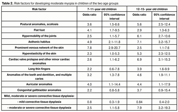 Results: The major phenotypic risk factors for developing moderate myopia in children of 7-11 years were prominent venous network of the skin (OR, 7.8; 95% CI, 2.9-20.7; p < 0.05), asthenic habitus (OR, 4.9; 95% CI, 2.1-11.8; p < 0.05), and flat foot (OR, 4.0; 95% CI, 1.7-9.5; p < 0.05), whereas in children of 12-15 years, these factors were moderate or severe connective tissue dysplasia (OR, 7.9; 95% CI, 3.2-19.3; p < 0.05), asthenic habitus (OR, 7.1; 95% CI, 3.2-15.7), cardiac valve prolapse and other minor cardiac anomalies (OR, 6.9; 95% CI, 3.1-15.3; p < 0.05),  hypermobility of the joints (OR, 6.1; 95% CI, 2.7-13.6; p < 0.05), postural anomalies and scoliosis (OR, 5.6; 95% CI, 2.5-12.4; p < 0.05), and hyperelasticity of the skin (OR, 5.3; 95% CI, 2.3-12.5; p < 0.05).