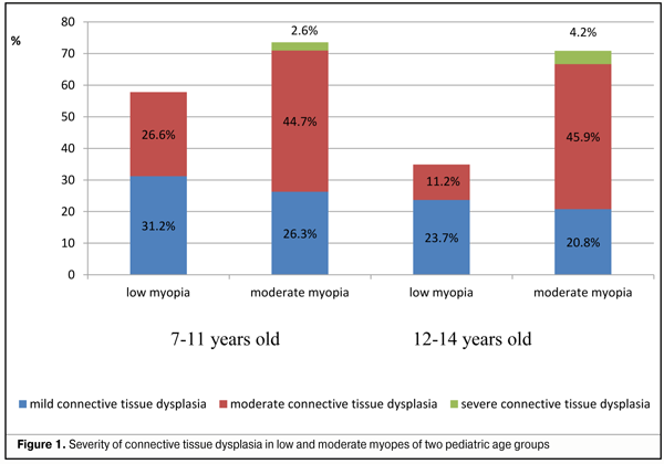 Conclusions: Low myopic children with a moderate or severe connective tissue dysplasia are at risk for developing moderate myopia. The major SUCTD-related risk factors for developing moderate myopia in children of 7-11 years were prominent venous network of the skin, asthenic habitus, and flat foot, whereas in children of 12-15 years, these factors were asthenic habitus, cardiac valve prolapse and other minor cardiac anomalies,  hypermobility of the joints, postural anomalies and scoliosis, and hyperelasticity of the skin.