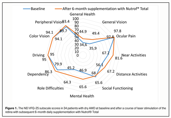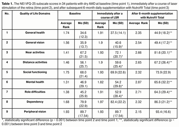 Introduction In 1997, Lee and colleagues [1] reported on the findings of a large-scaled study of the Quality of Life (QoL) of individuals with visual disorders using the SF-36, a general functioning and well-being instrument. They found that the impact of blurred vision on role limitations due to physical health problems was significantly greater than that of the disorders of other organs and body systems (including those presenting an immediate danger to life). This fact caused significant interest in the QoL of patients with various ocular disorders [2]. The 51-item field test version of the National Eye Institute Visual Function Questionnaire (NEI VFQ) was designed in the nineties in the USA to capture the influence of vision on multiple dimensions of health-related quality of life. However, that version was too long and required too much time to complete [3-4]. Therefore, the 25-item and 39-item (the NEI VFQ-25 and NEI VFQ-39) versions were designed and have been used for research and clinical settings [4-6]. Popescu and colleagues [7] have investigated a psychological component of the QoL in patients with age-related eye diseases and found that these patients were more likely to show signs of depression compared to older adults with good vision. Of patients with age-related macular degeneration (AMD), 11% to 44% have been reported to have significant depressive symptoms [8-10]. Depression develops in AMD patients as a result of reduced QoL. Thus, the prevalence of depressive disorders in community-dwelling adults with AMD has been found to be twice as high as that in community-dwelling elderly [11]. The use of low-intensity laser irradiation (LILI) has been found promising in treatment of early AMD due to basic mechanisms of action of LILI and non-invasiveness of the technique. In 1979, Linnik and colleagues demonstrated that increased synthesis of DNA in nuclei of the ganglial and neuroepithelial cells occurred immediately following retinal exposure to LILI and maintained for long periods, with improvement in cell resistance to damaging factors [12]. AMD requires long-term, often complex treatment regimens. Antioxidant agents (including xanthophylls e.g. lutein and zeaxanthin) are known for their capability for selective accumulation in the macula. They improve the function of the retinal pigment epithelium (RPE), and contribute to increase in RPE density and to normalization of retinal metabolic processes. Nutrients from the AREDS2 study (lutein, zeaxanthin, vitamin C, vitamin E, zinc, copper, eicosapentanoic acid [EPA], and docosahexanoic acid [DHA]) remain the most proven nutritional therapy for reducing the rate of advanced AMD [13]. In addition, in a 6-month control trial by Sinn and colleagues [14], it has been found that supplementing a diet with DHA and EPA reduced depressive symptoms and the risk of progressing to dementia in elderly people with mild cognitive impairment. We aimed to investigate the benefits of laser stimulation of the retina with subsequent 6-month daily nutrient supplementation for QoL in patients with age-related maculopathy (ARM) and AMD. Materials and Methods This was a prospective, open pilot study involving 34 patients (42 eyes; 16 (47%) male and 18 (53%) female; age, 47 years to 76 years) with ARM and dry AMD. Most of the patients were younger than 65 years. 91% of patients were of the working age. 42 eyes (62% of eyes of patients) included in the study had early ARM and dry AMD, with extrafoveal focus of atrophy. Twenty-six fellow eyes (38%) had advanced macular degeneration. All study eyes received 10 every-day sessions of diode laser stimulation of the retina (LSR) (wavelength, 650 nm; irradiance, mW/cm2; treatment timing, 300 s) using diode laser SM-4.3. Thereafter, patients were administered one capsule of Nutrof® Total (Laboratories Thea, France) daily for 6 months. The capsule contains polyunsaturated fatty acids of the omega-3 series (EPA, 40%; DHA, 20%); Vitamin C, 240mg; Vitamin E, 30 mg; Marigold extraction (lutein, 10 mg; zeaxanthin, 2 mg) and Vitis vinifera extraction (Resveratrol, 1 mg; copper, 500 ?g; Selenium, 25 ?g; and glutathione). Patients underwent comprehensive clinical and functional ophthalmological examination (visual acuity assessment, perimetry, ophthalmoscopy, fluorescence angiography, fundus camera imaging and optical coherence tomography) at baseline, immediately after a course of LSR, and after 6 months of supplementation with Nutrof® Total. The Russian-language version of the NEI VFQ-25 was used to assess the influence of vision on health-related quality of life. The reliability and validity of the NEI VFQ have been confirmed in a number of studies [15-17]. The 25 questions in the NEI-VFQ-25 are grouped in 12 sub-scales (including general health, general vision, ocular pain, near activities, distance activities, social functioning, mental health, role difficulties, dependency, driving, color vision and peripheral vision). A vision-specific composite score is calculated by averaging the vision-related subscale scores. Scores range from 0 to 100 with higher scores indicating better functioning. Patients completed the NEI VFQ-25 and HADS at baseline, after a course of LSR, and after a subsequent 6-month course of nutrient supplementation. Anxiety and depression were assessed using the Hospital Anxiety and Depression Scale (HADS) designed by Zigmond and colleagues [18]. Interpretation of the subscale scores (range from 0 to 21) was based on the following categories indicating clinical levels of anxiety and depression: 0 to 7, normal (no anxiety or depression); 8 to 10, moderate (subclinical anxiety or depression); and 11 to 21, caseness (clinical anxiety or depression). Patients completed the NEI VFQ-25 and HADS in 5-10 minutes. Longitudinal changes in the QoL were analyzed using Friedman’s ANOVA test. Post-hoc pairwise comparisons were made using the Wilcoxon signed-rank test. Mean (M), median (Ме), standard devia