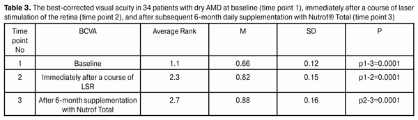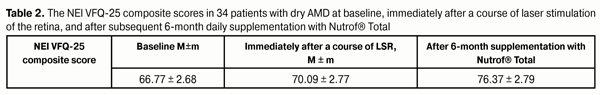 The analysis revealed a statistically significant improvement in QoL composite score following treatment (F=117.6; p=0.00001). The NEI VFQ-25 overall composite score increased to 70.1 (range, 39.4 до 92.8) immediately after a course of LSR. After 6 months of supplementation with Nutrof® Total, the score increased to 76.4 (range, 39.4 до 92.8), with a significant improvement in their social and psychological status. The baseline best-corrected visual acuity (BCVA) ranged from 0.45 to 0.85, with the mean BCVA (SD) of 0.66 (0.12) (Table 3). The mean BCVA (SD) improved to 0.82 (0.15) (range, 0.5 to 1.0) immediately after a course of laser therapy, and to 0.88 (0.16) after 6 months of supplementation with Nutrof® Total. At baseline, the percentage of eyes having a BCVA of 0.5 to 0.6 was substantially higher than of those having a BCVA of 0.9 to 1.0 (44% and 23%, respectively). The latter percentage increased to 47% by the end of the study. Table 3 shows that after a course of LSR and a subsequent 6-month supplementation with Nutrof® Total, an increase in mean visual acuity rank was statistically significant (?F2=59.4; p=0.00001): in 30 patients (88%), the mean percentage increase in visual acuity was 33.3%.