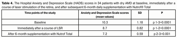 The improvement in the mean composite score after a 6-month nutrient supplementation was found to correlate with the improvement in mean BCVA (r=0.62; p=0.0001) and not to correlate with age (r=0.06; p=0.74) or with baseline BCVA (r=-0.11; p=0.52). Consequently, the improvement in BCVA, if achieved, would improve the QoL even in elderly patients with AMD. HADS questionnaire study results At baseline (before treatment), 17 patients (50%) had clinical or subclinical anxiety and/or depression (with HADS scores >11). Only one patient (2.9%) had clinical anxiety and/or depression after a course of LSR. Twenty-eight patients (82.4%) had normal HADS scores, and only 6 (17.6%) had clinical anxiety and/or depression after a 6-month nutrient supplementation. Although the intersex difference in anxiety and depression levels was not significant, among 31 study patients, the women's baseline (pre-treatment) and post-treatment mean HADS scores were 8% worse than the men's. The HADS anxiety and depression scores in patients with dry AMD ranged from 8 to 12.5 at baseline and decreased by 18% after a course of LSR, ranging from 7.5 to 10.5 points (this decrease was significant), and by 21% after a subsequent 6-month supplementation with Nutrof® Total, ranging from 6 to 9 points (Table 4). The overall emotional distress score improved by 43.1% in 29 patients (85.3%) after a 6-month daily nutrient supplementation.