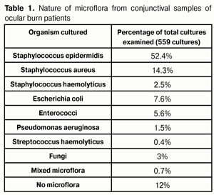 Background: Since ocular infection is common following ocular burns, and may lead to severe infectious complications like corneal ulcers, infiltrates and abscesses, prevention and treatment of these complications has been always important. Purpose: To investigate the nature of the microflora cultured from ocular burn patients and the sensitivity of this microflora to current antibacterial agents. Materials and Methods: We investigated conjunctival microflora from 184 ocular burn patients (224 eyes) at different time points following ocular burns. In total, 559 cultures were performed. Antibacterial and antiseptic agents under investigation included ciprofloxacin (Floximed), ofloxacin, levofloxacin (Levofloximed), moxifloxacin, gentamycin, tobramycin (Tobrimed), futaron, octenisept and betadine. Results: Microflora was cultured from 88% of the conjunctival samples examined. Staphylococcus epidermidis was the most commonly cultured organism (54.2%), followed by Staphylococcus aureus (14.3%), Escherichia coli (7.6%), Enterococci (5.6%), fungi (3.0%), Staphylococcus haemolyticus (2.5%), Pseudomonas aeruginosa (1.5%), and Streptococcus haemolyticus (0.4%). No organisms were isolated from 12% of the conjunctival microflora samples. The sensitivity of these microorganisms to each of the antibacterial agents under investigation was determined. Levofloxacin (Levofloximed), ciprofloxacin (Floximed), moxifloxacin, ofloxacin, gentamycin, and tobramycin (Tobrimed) demonstrated high antibacterial activity against the organisms. Conclusion: Following ocular burns, conjunctival microflora always contains organisms that can cause various infectious complications. Administration of antibacterial medications for prevention and treatment of infectious complications should be based on the sensitivity of the organisms to these medications. Prior to obtaining the results of sensitivity analyses of cultured microorganisms, or if such tests are unavailable, broad spectrum antibiotics, ? fluoroquinolones (moxifloxacin, levofloxacin (Levofloximed), and ciprofloxacin (Floximed)) and aminoglycosides (gentamycin and tobramycin (Tobrimed)) ? should be administered. If the microorganism exhibits no sensitivity to antibiotics, such antiseptics as octenisept or betadine may be administered. Key words: ocular burns, microflora, antibacterial therapy Introduction Necrotic tissue provides a medium for the growth of pathogenic microbes that can cause severe infectious complications (corneal ulcers, infiltrates and abscesses) following burns, and previously we have found evidence of ocular infection in 84% of the eyes following ocular burn injuries. In addition, necrotic tissue releases proteases that contribute to breakdown of the tissue damaged by burn. Therefore, prevention and treatment of infectious complications following ocular burns have been always important [1, 2]. On the other hand, since widespread use of antibiotics resulted in a rise of resistant organisms, a regime of antibiotic treatment must be based on knowledge of the antibiotic sensitivity patterns of the cultured microflora [1, 3-5]. The purpose of the study was to investigate both the nature of the microflora cultured in ocular burns and the sensitivity of this microflora to the antibacterial agents most commonly used today by practitioners (including us) in the treatment and prevention of infectious complications following ocular burns. Materials and Methods We investigated conjunctival microflora from 184 ocular burn patients (224 eyes; 104 males and 80 females; age, 18 years to 72 years) of the Ocular Burn Injury Department at the Filatov Institute at different times following burn injury. In total, 559 cultures were performed for these patients. Samples were obtained from the conjunctival sac, cultured on Muller-Hinton agar medium, and the sensitivity pattern to the antibacterial agent under study was determined at the Bacteriologic laboratory of the Institute using a standard methodology [6, 7]. Antibacterial and antiseptic agents under investigation included ciprofloxacin (Floximed), ofloxacin, levofloxacin (Levofloximed), moxifloxacin, gentamycin, tobramycin (Tobrimed), futaron, octenisept and betadine. Results and Discussion Microflora was cultured from 88% of the conjunctival samples examined. Staphylococcus epidermidis was the most commonly cultured organism (54.2%), followed by Staphylococcus aureus (14.3%), Escherichia coli (7.6%), Enterococci (5.6%), fungi (3.0%), Staphylococcus haemolyticus (2.5%), Pseudomonas aeruginosa (1.5%), and Streptococcus haemolyticus (0.4%). No organisms were isolated from 12% of the conjunctival microflora samples. Two or more of the organisms (Table 1) were cultured from 0.7% of samples. No substantial changes in the nature of the conjunctival microflora were identified at different treatment time points after admittance to the clinic. The incidence of detection of S. aureus and Escherichia coli in the conjunctival microflora somewhat increased during the treatment process.