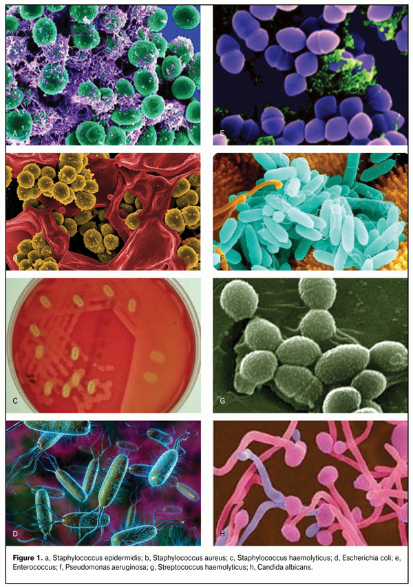 Staphylococcus aureus (Fig. 1 b) is an extremely adaptable and versatile organism that is implicated in practically any problem related to stafilococci, and expresses a variety of virulence factors. The organism was cultured from 14.3% of the conjunctival samples examined. These bacteria were given the specific epithet Staphylococcus aureus because of the yellow-to-orange microscopic colony appearance. The organism is markedly resistant to external environmental conditions. S. aureus capsule induces inflammatory and allergic responses, while neutralizing immunoglobulins immobilize phagocytes. These pathogens secrete numerous enzymes that degrade cell walls and reduce the effect of antibiotics. In addition, special enzyme, coagulase, is secreted that targets the blood clotting cascade, and bacteria become entrapped within microthrombi. Moreover, S. aureus produces hemolysins that destroy red blood cells, white blood cells, etc, and releases at least ten toxins with different modes of action. Staphylococcus haemolyticus (Fig.1c), an opportunistic pathogen, colonizes the skin and mucous membranes of humans. The organism was cultured from 2.5% of the conjunctival samples examined. Both the invasive and toxigenic features of the pathogen play a role in S. haemolyticus infections, and it also can cause severe infectious complications following burn injuries. Escherichia coli (Fig.1d) is a Gram negative rod (bacillus) species and a facultative anaerobe. It is a member of the normal microflora of the human intestinal tract and is regarded as an opportunistic pathogen that may cause a disease in a host that is physically impaired or debilitated. Under certain conditions, it can enhance its pathogenic potential and cause severe infectious complications. Enterococcus (Fig. 1e) is a genus of ubiquitous, Gram-positive, non-spore-forming, facultative anaerobic cocci that often occur in pairs (diplococci) or short chains and are tolerant of a wide range of environmental conditions. The organism was cultured from 5.6% of the conjunctival samples examined. These cocci are highly resistant to various disinfectants, and, over the past three decades, have acquired resistance to practically all existing classes of antimicrobial agents. High levels of endemic antibiotic resistance are the most important feature of the Enterococcus genus. Over the past two decades, especially virulent, vancomycent-resistant enterococci strains emerged that can cause nosocomial infections [6]. Pseudomonas aeruginosae (Fig.1f), the most dangerous representative of the pathogenic flora, is a species of Gram-negative, motile, rod shaped bacteria. The organism was cultured from 1.5% of the conjunctival samples examined. The pathogenic features of the organism are associated with the synthesis of various exotoxins, endotoxins and proteolytic enzymes (neutral protease, elastase and collagenase). These features become prominent most commonly in immunocompromised individuals, burn patients, and those undergoing long-term antibacterial therapy. Motility, toxins and hydrolytic enzymes contribute to the pathogenicity of Pseudomonas aeruginosae. It produces an extra-cellular glycocalyx (slime) and may occur in the environment as a glycocalyx-enclosed micro¬colony. The ability to develop and acquire antibiotic resistance contributes to the success of the pathogen. 5% chloramine, 3% hydrogen peroxide and 2% phenol are the only means effective in combating Pseudomonas aeruginosa infection. Streptococcus haemolyticus (Fig.1 g) is a Gram-negative, non-spore-forming species with marked hemolytic activity and coccoid morphology. It is ubiquitous and often colonizes the skin and mucous membranes of humans. The pathogenesis is associated with toxin production. The yeastlike fungus Candida albicans (Fig. 1h) was cultured from 3.0% of the conjunctival samples examined, more commonly from burn patients who received intensive antimicrobial therapy. Candida albicans grows as oval-shaped budding yeast (blastospore) forming pseudomycelia in cultures, tissues and exudates. Although this fungus is a component of the normal microflora of mucous membranes, it can lead to the development of a number of pathological conditions (corneal ulcers, infiltrates and abscesses), especially in frail or debilitated individuals or those on immuno-suppressive and antibacterial therapy. To prevent infectious complications following ocular burns, antibacterial treatment was prescribed on admission to the clinic, with the regime based on the antibacterial sensitivity patterns of cultured organisms. Antibacterial agents were administered as eye drops or eye spray. However, in severe ocular burns, they were administered also as peribulbar or subconjunctival injections. In addition, in some severe burn cases, intramuscular injections were administered to achieve maximum concentration of an agent in the ocular tissues. In some patients, conjunctival cultures remained positive for organisms in spite of antibacterial therapy, with the species pattern varying with time. These facts indicate that, within the treatment process following ocular burns, conjunctival microflora cultures should be taken on a regular basis (at least 1-2 times a week) for culture-directed antibacterial therapy [4]. This approach allowed us to avoid severe infectious complications in most of cases. The duration of antibacterial therapy depended on the severity of burn injury, and on whether corneal ulcers or infectious complications were present. Current antibacterial agents (fluoroquinolones, such as ciprofloxacin, ofloxacin, levofloxacin and moxifloxacin; aminoglycosides, such as gentamycin and tobramycin; and fusidic acid (futaron)) were administered to suppress infection. If this treatment failed, antiseptics (octenisept and betadine) were used. Fluoroquinolones (ciprofloxacin, ofloxacin, levofloxacin and moxifloxacin (Vigamox)) are nalidixic acid derivatives and inhibit (1) bacterial DNA-gyrase, a tetra