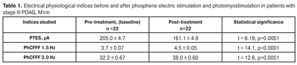 Conclusion Thus, the combination of FES and photomyostimulation made it possible to significantly increase the functional activity of the visual system. PTES decreased by 21.4%, PhCFFF in the 1.5 and 3.0 modes increased by 21.6% and 18.1%, respectively. The mean deviation of light sensitivity decreased by 14.6% and the mean retinal light sensitivity according to all MS threshold values increased by 17.9 % with summarized visual field enlarged by 14.8%. The treatment resulted in the improvement of the oculomotor system functional mobility according to the IMF index in all three modes and of the visual system lability according to the static and kinetic CFFF and CFAF indices. The method proposed had a positive effect on ocular hemodynamics. Thus, the facility of aqueous outflow increased by 29.4%, the Ро/С coefficient decreased by 27.1%, and the rate of aqueous flow increased by 31.1%.