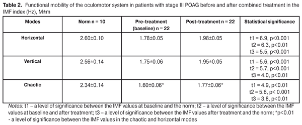 The activity of the papillomacular bundle was also improved: the PhCFFF values statistically significantly increased both in the 1.5 and 3.0 modes from 3.7±0.07 to 4.5±0.05 Hz, i.e. by 21.6% (р = 0.0001) and from 32.2±0.67 to 38.0±0.6 Hz, i.e. by 18.1% (р = 0.0001), respectively (Table 1). Afterwards, we studied the functional mobility of the oculomotor system. The mean value of IMF in H-mode increased by 11.2% (р < 0.001): 1.78±0.05 Hz at baseline vs. post-treatment 1.98±0.05 Hz. In V-mode the mean IMF value increased by 11.4 %: from pre-treatment 1.75±0.06 Hz to post-treatment 1.95±0.05 Hz (р<0.001). The IMF value in C-mode averaged 1.60±0.06 Hz at baseline and significantly increased to 1.77±0.06 Hz (p<0.001), i.e. by 10.6%, after treatment. Comparison of the data showed that the mean IMF value in C-mode both at baseline and after treatment was significantly lower than that in H-mode (Table 2).