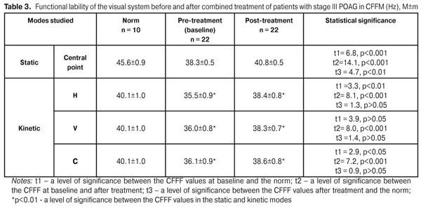 Thus, the 10 FES sessions, performed in combination with photomyostimulation in patients with stage III POAG, made it possible to significantly increase the mobility of the oculomotor system in the IMF index in all three modes. However, the IMF values in the three modes remained far below the norm even after treatment performed. Data on the lability of the visual system at baseline after combined treatment in the CFFF index are given in Table 3.