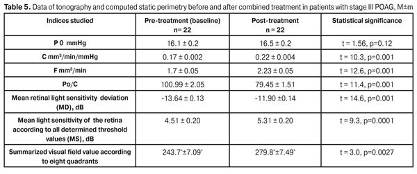 So, the combined treatment course being performed in patients with stage III POAG, the functional lability of the visual system significantly improved and did not differ from the norm in all indices studied, apart from the PTES index in the static mode. This gives evidence that the combination of FES and photomyostimulation has a positive effect on the lability function of the visual system in patients with stage III POAG. Also, we analyzed the state of ocular hemodynamics at baseline and after the combined treatment using the method of FES and photomyostimulation. The mean value of IOP (P0) did not change significantly: 16.1±0.2 mmHg vs.16.5±0.2 mm Hg, at baseline and after treatment, respectively. The mean value of the facility of aqueous outflow (C) increased after treatment by 29.4% (р = 0.001): from 0.17±0.002 at baseline to post-treatment 0.22±0.004 mm3/min (Table 3). The Ро/С coefficient significantly improved by 27.1%: 100.99±2.05 vs. 79.45±1.51, at baseline and after treatment, respectively (р = 0.001). By 31.1% increased the rate of aqueous flow (F): from 1.7±0.05 to 2.23±0.05 mm3/min, respectively (р=0.001). The data obtained demontstrate an apparent positive effect of the therapy. The combined treatment resulted in significantly improved data of the computed static perimetry data. The mean deviation of light sensitivity improved by 14.6% (р = 0.001), from -13.64±0.13 dB to -11.90±0.14 dB; and the mean retinal light sensitivity according to all MS threshold values increased from 4.51±0.22 dB to 5.31±0.23 dB, i.e. by 17.9% (р = 0.034). Also, a significant increase was noted in summarized visual field according to 8 quadrants: from pre-treatment 243.7°±7.09° to post-treatment 279.8°± 7.49°, i.e. by 14.8% (р=0.0041) (Table 5). At the same time, the therapy performed did not influence significantly on the visual acuity. The mean visual acuity value equaled 0.31±0.03 and 0.33±0.03, at baseline and after treatment, respectively (р=0.56).