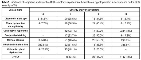 As it can be seen in Table 1, patients with subclinical hypothyroidism were more often revealed clinical symptoms and objective signs of DES corresponding to stage I and II of the syndrome. Thus, complaints of discomfort  in  the  area  of  the eyeball and visual dysfunction during the day, which refer to DES stages I and II, were presented by 73.1 and 76.9 of patients, respectively. Conjuctival fluoroscein staining corresponding to DES stages I and II was noted in 82.7% and 90.4 %, respectively. Conjunctival hyperemia corresponding to stages I and II of DES was noted in 55.8% of patients and that corresponding to stage III was noted in 44.2% of patients with subclinical hypothyroidism. Inclusions in the tear film and conjunctival folds corresponding to DES stages I and II were observed in 90.3% and 78.8%, respectively. Meibomian gland dysfunction of stages I and II was revealed in 73.1 of patients. Clinical symptoms and objective signs of DES corresponding to DES stage III were less often revealed.