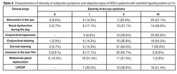 In manifest hypothyroidism the symptoms and clinical signs corresponding to DES stage I were rarer while those corresponding to stage III were more often (Table 2). Thus, complaints of discomfort in the eyeball corresponding to stage I and stage III of DES were presented by 14.3% and 57.1% of patients, respectively. Complaints of visual dysfunction, corresponding to DES stage I, were in 17.1% of patients vs. 40.0% of patients with those corresponding to stage III. Conjunctival hyperemia corresponding to stage I and stage III was noted in 8.6% and in 62.9% of patients. Conjunctival staining corresponding to stage I and to stage III of DES was noted in 14.3% and 54.3%, respectively. LIPCOF corresponding to DES stage I were in 29.0% of patients vs. 51.4% of patients with stage III LIPCOF.  Clinical signs of DES as corneal staining, inclusions in the tear film, and meibomian gland dysfunction in manifest hypothyroidism more often corresponded to stage II of DES: 60.0%, 65.7%, and 51.4% of cases, respectively.
