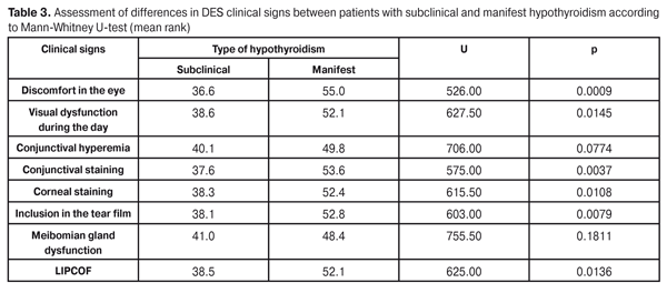 Data in Table 3 demonstrates that, of eight DES clinical signs studied, the indices of six ones (discomfort in the eye, visual dysfunction during the day, conjunctival and corneal staining, the presence of inclusion in the tear film, the presence of lower lid parallel conjunctival folds) were significantly different in patients with subclinical and manifest hypothyroidism. Herewith, the most differences in mean ranks of DES signs studied were noted in such signs as discomfort in the eye, conjunctival staining and the presence of inclusions in the tear film.