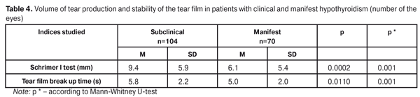 Comparison of the quantitative indices that characterize the volume of tear production and tear film stability in patients with subclinical and manifest hypothyroidism showed that a summed value of tear production was 9.4 (SD5.9) mm in subclinical hypothyroidism while that was significantly lower, 6.1(SD5.4) mm, in manifest hypothyroidism (р=0.0002). Stability of the tear film was also lower in manifest than in subclinical hypothyroidism, 5.04(SD2.0) and 5.84(SD2.2) s, (р=0.0110), respectively (Table 4).