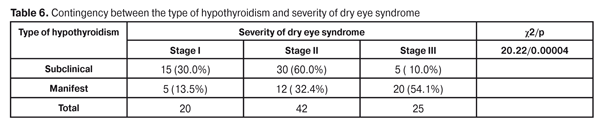 3. Severe stage of dry eye syndrome was significantly more often observed in manifest hypothyroidism as compared to subclinical hypothyroidism: 54.1% and 10.0%, respectively.