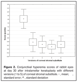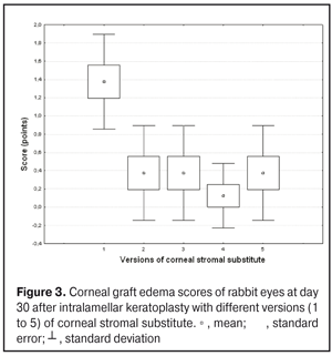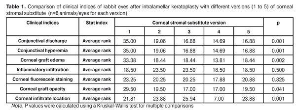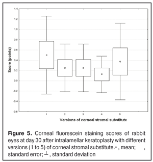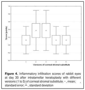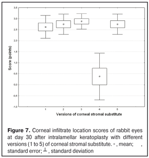 The lowest clinical scores for conjunctival discharge, corneal graft edema, inflammatory infiltration, corneal graft opacity and corneal fluorescein staining (0.13 points) were noted in rabbit eyes that underwent intralamellar keratoplasty with a version 4 corneal stromal substitute. Location of inflammation in the cornea was found to be paracentral in eyes that improved clinically after IKP with version 1, 2, 3 or 5 CSS, and tended to be central (0.38 points) in those that underwent IKP with version 4 CSS. Therefore, the least apparent reaction was noted in the rabbit eyes that underwent IKP with a version 4 CSS, which makes this CSS promising for further investigations in pre-clinical and clinical studies.