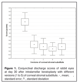 Materials and Methods: Corneas were excised from enucleated pig eyes, and, to develop acellular CSSs, five methods of decelluarization of porcine corneas were used that were different in the time and conditions of incubation with detergents (0.5% sodium dodecyl sulphate or TRITON X-100) and proteolytic enzymes (like 0.1% papain). In addition, an ultrasonic apparatus of type СD 3800 А was used to further improve the removal of cells and acellular corneal debris. A total of 40 Chinchilla rabbits were used in the animal study. They were divided into 5 groups with different CSS versions. In each rabbit, the monocular IKP was carried out with one of the five CSS versions. Postoperatively, antimicrobial and anti-inflammatory therapy was instituted. Animals were examined every other day for 30 days postoperative. This included corneal fluorescein staining. In addition, the following was assessed ophthalmoscopically: conjunctival discharge, conjunctival hyperemia, state of the CSS, state of the host cornea, and, at late follow-up examinations, graft acceptance and whether graft-versus-host disease was present.