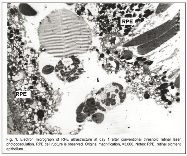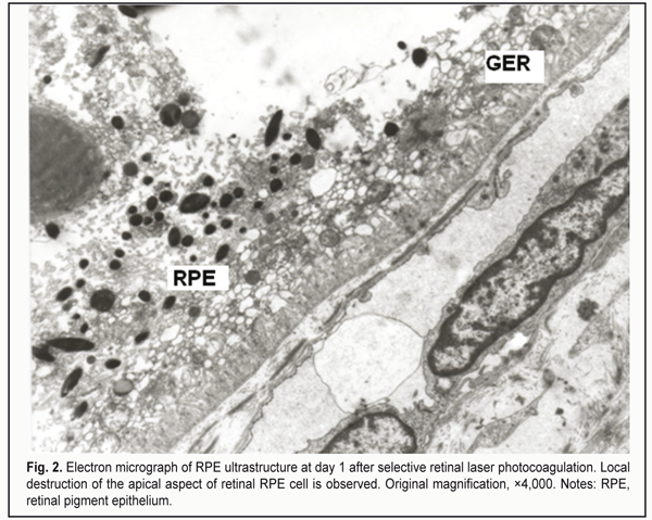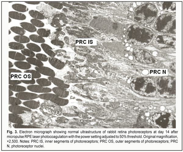 Discussion As far as we know, there is no unanimously adopted approach to performing micropulse retinal laser photocoagulation. Authors vary in approaches to applying subthreshold laser therapy with 577-nm laser [2-10]. Roider and colleagues [7-9] investigated the mechanism of the selective RPE damage induced by repetitive microsecond laser pulses in rabbits. They noted that selective damage to the RPE with sparing of adjacent structures can be obtained with laser pulses shorter than the time needed for heat conduction to spread temperature rise to adjacent sites, but long enough to induce damage to target structures. In addition, histological findings demonstrated substantial differences in outcomes between continuous wave (CW) laser photocoagulation of the retina and selective RLPC. Severe damage to the RPE was found in either of the two approaches used. In the RPE layer, the investigators observed damage to the RPE cells, with their subsequent replacement by a monolayer of new RPE cells. In addition, after retinal exposure to repetitive short laser pulses, the photoreceptors were arranged normally, and no damage to most of them was observed; the choriocapillaries remained unaffected, and intact red blood cells were observed. However, after conventional RLPC, the PRC were uniformly destroyed, and the choriocapillaries showed signs of damage. In contrast to CW photocoagulation, only minimal inflammatory response was found after selective RLPC, and macrophages, fragmented RPE cells, and lymphocytes were revealed in the damaged PRC layer [7-9]. Pasyechnikova et al [3] used selective (or subthreshold millisecond) RPE photocoagulation with millisecond pulses from a 532-laser in the treatment of diabetic macular edema and other fundus disorders. Lavinsky and Palanker [5] used a similar subthreshold RLPC approach for the treatment of chronic central serous chorioretinopathy (CSCR) with a 577-nm laser. The laser power was first titrated for a barely visible burn with 15-ms pulses, which was defined as 100% pulse energy. Treatment was then applied over the area of serous retinal detachment and adjacent nonthickened retina, using 30% pulse energy with the spot spacing of 0.25 beam diameter. Another titration protocol for adjustment of laser power and duration was used in the study of Yadav et al [9] of the treatment of CSCR with the 577-nm yellow micropulse laser. Initially, a continuous wave ‘test’ spot size of 100 mm, 0.2 s exposure time, and using enough power to cause mild retinal whitening was placed superonasally. Thereafter, they used similar settings, but with half the power, for CSCR treatment with micropulse RLPC. Romanova [4] suggested proceeding as follows: to titrate the power levels using a continuous wave, to activate the micropulse mode and to adjust the power by doubling it. However, this approach is associated with some problems, since it is difficult to predict how the laser parameter values will change following activation of the micropulse mode, with the values of two laser parameters (exposure time and power) changing simultaneously. Maia [6] also demonstrated the efficacy of 577-nm micropulse laser for CSCR, however, without mentioning his approach to titration of laser parameters for individual patient. In the study of Scholz et al [8], the individual power for the patient was titrated at a normal area of the retina, near the affected area in the monospot micropulse mode. The power titration was gradually increased until a just visible burn was seen. When this threshold was reached, the power was reduced by 50%. With this power, the subthreshold micropulse laser treatment of the affected retina was performed. We favor this approach to titration of laser parameters in the individual patient, since while adjusting the threshold laser power in the micropulse mode before switching to therapeutic treatment we adjust a single laser parameter (laser power). Therefore, with this approach, the effect of subthreshold micropulse laser applied in the absence of visible retinal photocoagulation lesions becomes more predictable. In our current electron microscopy study, at day 1 after micropulse RLPC with the power setting adjusted to 50% threshold, mild reactive changes were observed mostly in the apical aspect of RPE cells. However, these changes were found to be reversible, and practically vanished in the structures under investigation by day 14. Selective RLPC resulted in 1) more severe damage to RPE cells, which was more profound, up to destruction, and extended towards the choroid, and 2) damage to PRC OS without involvement of the nuclear compartment of the cell. This improved the potential for the restoration of PRC ultrastructure. In addition, a great capacity of RPE cells for compensatory and restorative processes (in particular, intracellular processes) was implemented at day 14. Conventional threshold laser photocoagulation resulted in the most severe and irreversible changes in the RPE cells, all photoreceptor compartments and choriocapillaries. Conclusion 577-nm micropulse RLPC with the power setting adjusted to 50% threshold is a more photoreceptor- and choriocapillaris-sparing approach compared to conventional or selective RLPC, and can be used in clinical practice as a laser treatment approach providing the least invasive effect on the chorioretinal complex. Availability of different 577-nm RLPC modes makes it possible to select the required extent of damage to the complex. Thus, conventional RLPC results in damage to RPE cells, all photoreceptor compartments and choriocapillaries; selective RLPC results in damage to RPE cells and photoreceptor outer and inner segments; and micropulse RLPC with the power setting adjusted to 50% threshold results in damage mostly to apical aspects of RPE cells and photoreceptor outer segments. At day 14 after micropulse RLPC with the power setting adjusted to 50% threshold, restoration of the ultrastructure of the chorioretinal comp