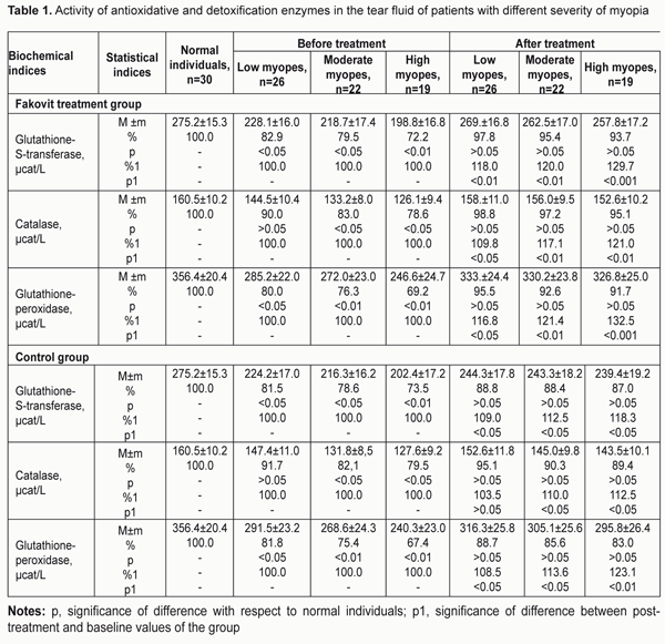 https://doi.org/10.31288/oftalmolzh201743139 Antioxidative status as assessed by enzymatic activity in the tear fluid and by the levels of sulfur-containing protein groups in the blood and tear fluid of myopes before and after treatment with a thiol agent E.I. Surova, a Postgraduate student, I.M. Boichuk, Dr. of Sc. (Med.), S.G. Kolomiichuk, a research fellow Filatov Institute of Eye Diseases and Tissue Therapy; Odessa (Ukraine) E-mail: iryna.ods@gmail.com Background: Myopia remains a leading cause of vision loss and visual disability in Ukraine (75%) and one of the most common ocular disorders worldwide. Most of available biological materials like blood and tear fluid can be used to measure the levels of these compounds, and thus to assess the relative balance between lipid peroxidation (LPO) and antioxidant system (AOS) in myopes. This will enable to find a pharmacological way for normalizing this balance in order to prevent degenerative retinal changes, and to stop the progression of myopia. Purpose: To evaluate the antioxidant status in patients with different severity of myopia based on the activity of enzymes (glutathione-S-transferase (GST), catalase (CAT), and glutathione peroxidase (GPx)) in their tear fluid and of sulfur-containing protein groups in their blood and tear fluid before and after treatment with Fakovit, a thiol agent. Materials and Methods: The Facovit treatment group included 67 myopes (low myopes, n = 26; medium myopes, n = 22; high myopes, n = 19) aged 12-24 years, whereas the control group included 67 aged-matched who did not receive Facovit treatment. In addition, 30 aged-matched healthy individuals were included into the study. Results: At baseline, GPx neutralized lipid hydroperoxides too slowly, and GST activity was markedly inhibited, with GST activity in the tear fluid and in the blood in low, moderate and high myopes of the Fakovit treatment group being statistically significantly lower than in normal individuals. In addition, CAT activity in the tear fluid in moderate and high myopes of this group was low. The baseline levels of free and protein-bound sulphydryl and disulphide groups in the tear fluid in low, moderate and high myopes of the Fakovit treatment group were abnormal, indicating substantial abnormalities of the AOS, with the tear fluid levels of free sulfhydryl groups and of protein-bound sulfhydryl groups being statistically significantly lower, and with the tear fluid levels of free disulphide groups and of protein-bound disulphide groups being higher than in normal individuals. Biochemical study demonstrated that the treatment including the thiol agent resulted in a substantial increase in the activity of enzymes (GPx and GST) of the detoxification system. Consclusion: Fakovit was found to have a substantial antioxidation effect on thiols in myopia, with increase in the levels of free sulfhydryl groups and decrease in the levels of protein-bound disulphide groups in the blood and tear fluid. Key-words: myopia, antioxidation system, enzymatic activity in the tear, level of sulfur-containing protein groups in blood and tear fluid, Fakovit, a tiol agent Introduction Myopia remains a leading cause of vision loss and visual disability in Ukraine (75%) and one of the most common ocular disorders worldwide. Clinical studies have demonstrated that more than 40% of children and adolescents with progressive myopia develop central or peripheral chorioretinal dystrophy, with the incidence of this dystrophy substantially increasing with age, severity and duration of myopia. Abnormal metabolism in the scleral connective tissue, choroid and retina results in further progression of myopia with the development of irreversible desctructive changes followed by vision loss, and, subsequently, by limitations in choice of profession and by disability [1]. Activation of lipid peroxidation (LPO) in the sclera and tear of patients with progressive myopia has been demonstrated in numerous studies [1-7]. Antioxidants, the substances protecting the body from free radicals, are divided into enzymatic and nonenzymatic. Free radicals can destroy biological molecules, including nucleic acids, proteins, carbohydrates and lipids, in enzymatic reactions following oxidative stress. The compounds formed as a result of these reactions can become biomarkers of the balance between LPO and antioxidant system (AOS). Most of available biological materials like blood and tear fluid can be used to measure the levels of these compounds in myopes, and thus to evaluate the relative balance between the systems. This will enable to find a pharmacological way for normalizing this balance in order to prevent degenerative retinal changes and to stop the progression of myopia. There have been reports on studies on the biochemical composition of tear fluid in various ocular disorders [1,4,6,8]. Previously we have reported on the analysis of changes in the antioxidant status based on the blood enzyme levels in myopes following treatment with Fakovit, a thiol agent [9]. It should be noted that the level of free SH groups determines the level of reduced glutathione, whereas the level of free SS groups determines the level of oxidized glutathione. Currently, the extent to which the levels of free and protein-bound SH and SS groups in the tear fluid and blood deviate from the norm is considered essential for antioxidant defense. To our best knowledge, antioxidant status has never been studied in the tear fluid of patients with different severity of myopia, and this is the first study to report the antioxidant status in the tear fluid and blood of such patients before and after treatment with a thiol agent. The purpose of this study was to evaluate the antioxidant status in patients with different severity of myopia based on the activity of enzymes (glutathione-S-transferase (GST), catalase (CAT), and glutathione peroxidase (GPx)) in their tear fluid and of sulfur-containing protein groups in their 