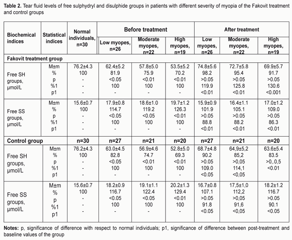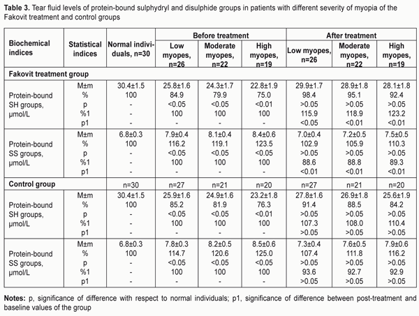 At baseline (before treatment), in low, moderate and high myopes of the Fakovit treatment group, the tear fluid levels of free sulfhydryl (SH-) groups were 19.1%, 24.1%, and 29.8%, respectively, lower than in normal individuals. After treatment, in low, moderate and high myopes of the Fakovit treatment group, the tear fluid levels of free sulfhydryl groups increased by 19.9% (p < 0.01), 25.8% (p < 0.01) and 30.6% (p < 0.001), respectively, and became normal. At baseline (before treatment), in low, moderate and high myopes of the Fakovit treatment group, the tear fluid levels of free disulphide (SS-) groups were 14.7% (p < 0.05), 19.2% (p < 0.05) and 26.3% (p < 0.01), respectively, lower than in normal individuals. After treatment, in low, moderate and high myopes of the Fakovit treatment group, the tear fluid levels of free disulphide (SS-) groups increased by 11.2%, 11.8% and 13.7%, (p < 0.01), respectively, and became normal. At baseline (before treatment), in low, moderate and high myopes of the control group, the tear fluid levels of free sulfhydryl (SH-) groups were 17.2% (p < 0.05), 25.3% (p < 0.01) and 30.7% (p < 0.01), respectively, lower than in normal individuals. After treatment, in low, moderate and high myopes of the control group, the tear fluid levels of free sulfhydryl (SH-) groups increased by 9%, 14.1% and 20.5%, (p < 0.01), respectively, and became normal. At baseline (before treatment), in low, moderate and high myopes of the control group, the tear fluid levels of free disulphide (SS-) groups were 16.7% (p < 0.05), 22.4% (p < 0.05) and 29.4% (p < 0.01), respectively, lower than in normal individuals. After treatment, in low, moderate and high myopes of the control group, the tear fluid levels of free disulphide groups increased by 8.2%, 8.4% and 9.9%, (p < 0.05), respectively, and became closer to normal. Overall, the data of Table 2 demonstrate normalization of the sulfur-containing protein component of the AOS in the tear fluid of myopic patients after treatment, with the improvement being more pronounced in patients treated with a thiol agent than in conventionally treated patients. Table 3 presents data on the levels of protein-bound sulphydryl (SH-) and disulphide (SS-) groups in the tear fluid of patients with different severity of myopia of the Fakovit treatment and control groups.
