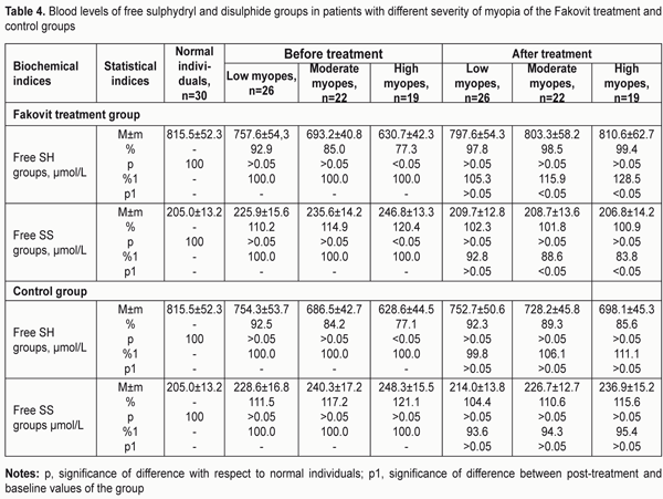 The table shows that, at baseline (before treatment), in low, moderate and high myopes of the Fakovit treatment group, the tear fluid levels of protein-bound sulphydryl groups were 15.1% (p < 0.05), 20.1% (p < 0.05) and 25% (p < 0.01), respectively, lower than in normal individuals (30.4±1.5 ?mol/L). After treatment with a thiol agent (Fakovit), in low, moderate and high myopes of this group, the tear fluid levels of protein-bound sulphydryl groups increased by 15.9% (p < 0.05), 18.9 (p < 0.01) and 23.2% (p < 0.01), respectively, compared to baseline. At baseline (before treatment), in low, moderate and high myopes of the Fakovit treatment group, the tear fluid levels of protein-bound disulphide (SS-) groups were 16.2%, 19.1% and 23.5% (p < 0.05), respectively, higher than in normal individuals (30.4±1.5 ?mol/L). After treatment with Fakovit, in low, moderate and high myopes of this group, the tear fluid levels of protein-bound disulphide groups decreased by 11.4%, 11.2 and 11.7% (p < 0.01), respectively, and became closer to normal. At baseline (before treatment), in low, moderate and high myopes of the control group, the tear fluid levels of protein-bound sulphydryl (SH-) groups were 14.8% (p < 0.05), 18.1% (p < 0.05), and 23.7% (p < 0.01), respectively, lower than in normal individuals. After conventional treatment, in low, moderate and high myopes of this group, the tear fluid levels of protein-bound sulphydryl groups decreased by 7.3%, 8.0 and 10.4%, respectively, but the decrease was not significant (р > 0.05). At baseline (before treatment), in low, moderate and high myopes of the control group, the tear fluid levels of protein-bound disulphide (SS-) groups were 14.7%, 20.6% and 25% (p < 0.05), respectively, higher than in normal individuals. After conventional treatment, in low, moderate and high myopes of this group, the tear fluid levels of protein-bound disulphide groups decreased by 6.3%, 7.3% and 7.1%, respectively, but the decrease was not significant (р > 0.05). Therefore, after treatment, the tear fluid levels of protein-bound sulphydryl (SH-) and disulphide (SS-) groups in the control group did not change, whereas those in the Fakovit treatment group became closer to normal, indicating an improvement in the antioxidant defense system in the tear fluid. We also evaluated the relative balance between LPO and AOS in the blood of patients with different severity of myopia based on the levels of sulfur-containing protein groups. Table 4 presents data on the levels of free sulphydryl (SH-) and disulphide (SS-) groups in the blood of patients with different severity of myopia of the Fakovit treatment and control groups.